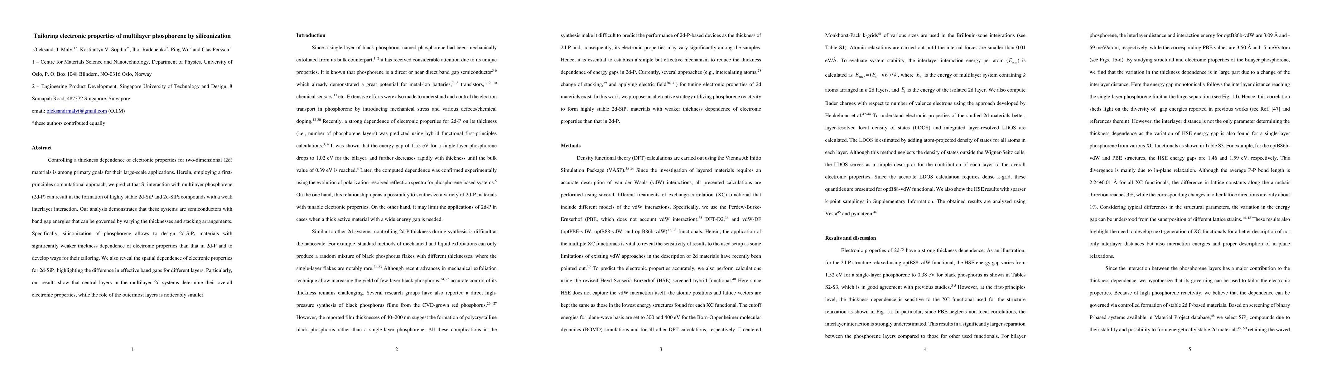 Controlling a thickness dependence of electronic properties for two-dimensional (2d) materials is among primary goals for their large-scale applications. Herein, employing a first-principles computational approach, we predict that Si interaction with multilayer phosphorene (2d-P) can result in the formation of highly stable 2d-SiP and 2d-SiP$_2$ compounds with a weak interlayer interaction. Our analysis demonstrates that these systems are semiconductors with band gap energies that can be governed by varying the thickness and stacking order. Specifically, siliconization of phosphorene allows to design 2d-SiP$_x$ materials with significantly weaker thickness dependence of electronic properties than that in 2d-P and to develop ways for their tailoring. We also reveal the spatial dependence of electronic properties for 2d-SiP$_x$ highlighting difference in effective band gaps for different layers. Particularly, our results show that central layers in the multilayer 2d systems determine overall electronic properties, while the role of the outermost layers is noticeably smaller.
