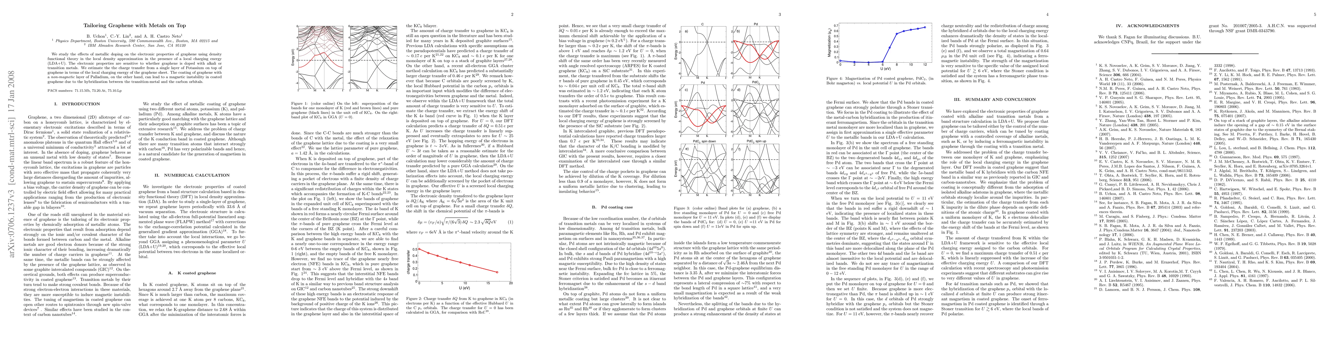 We study the effects of metallic doping on the electronic properties of graphene using density functional theory in the local density approximation in the presence of a local charging energy (LDA+U). The electronic properties are sensitive to whether graphene is doped with alkali or transition metals. We estimate the the charge transfer from a single layer of Potassium on top of graphene in terms of the local charging energy of the graphene sheet. The coating of graphene with a non-magnetic layer of Palladium, on the other hand, can lead to a magnetic instability in coated graphene due to the hybridization between the transition-metal and the carbon orbitals.