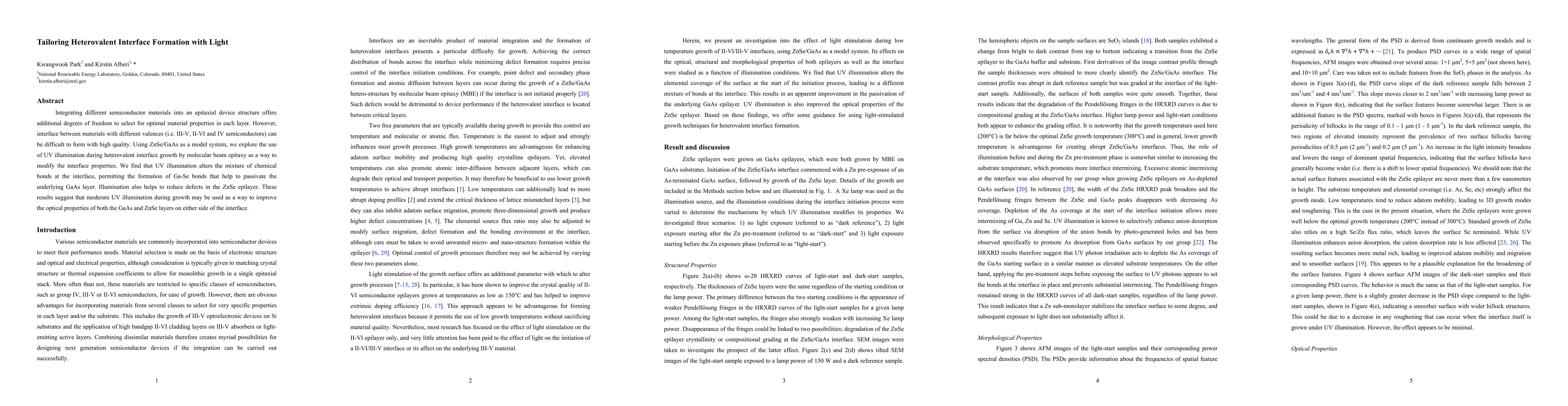 This research demonstrates that using moderate UV illumination during growth can improve heterovalent interface quality in semiconductor devices, like ZnSe/GaAs. It alters bond mixing at the interface, facilitating Ga-Se bond formation for GaAs passivation and reducing ZnSe epilayer defects, enhancing optical properties of both layers.