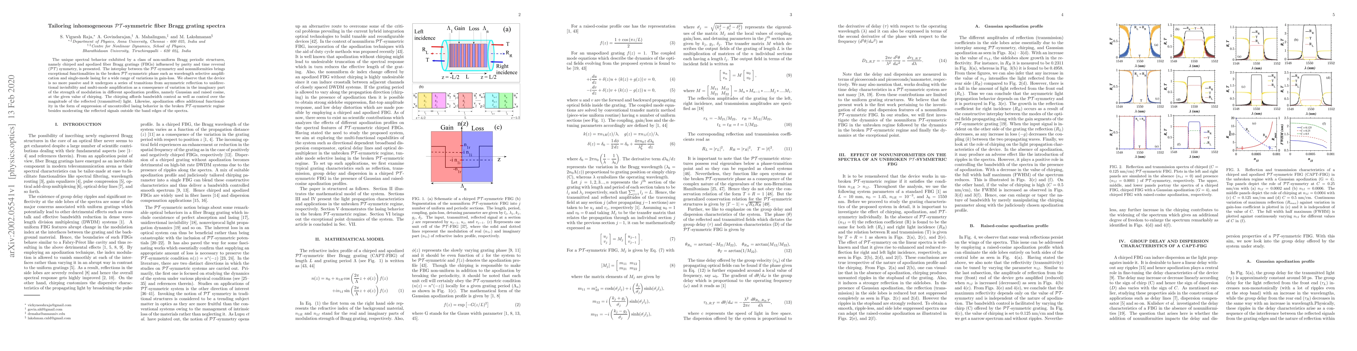 The unique spectral behavior exhibited by a class of non-uniform Bragg periodic structures, namely chirped and apodized fiber Bragg gratings (FBGs) influenced by parity and time reversal ($\mathcal{PT}$) symmetry, is presented. The interplay between the $\mathcal{PT}$-symmetry and nonuniformities brings exceptional functionalities in the broken $\mathcal{PT}$-symmetric phase such as wavelength selective amplification and single-mode lasing for a wide range of variations in gain-loss. We observe that the device is no more passive and it undergoes a series of transitions from asymmetric reflection to unidirectional invisibility and multi-mode amplification as a consequence of variation in the imaginary part of the strength of modulation in different apodization profiles, namely Gaussian and raised cosine, at the given value of chirping. The chirping affords bandwidth control as well as control over the magnitude of the reflected (transmitted) light. Likewise, apodization offers additional functionality in the form of suppression of uncontrolled lasing behavior in the broken $\mathcal{PT}$-symmetric regime besides moderating the reflected signals outside the band edges of the spectra.