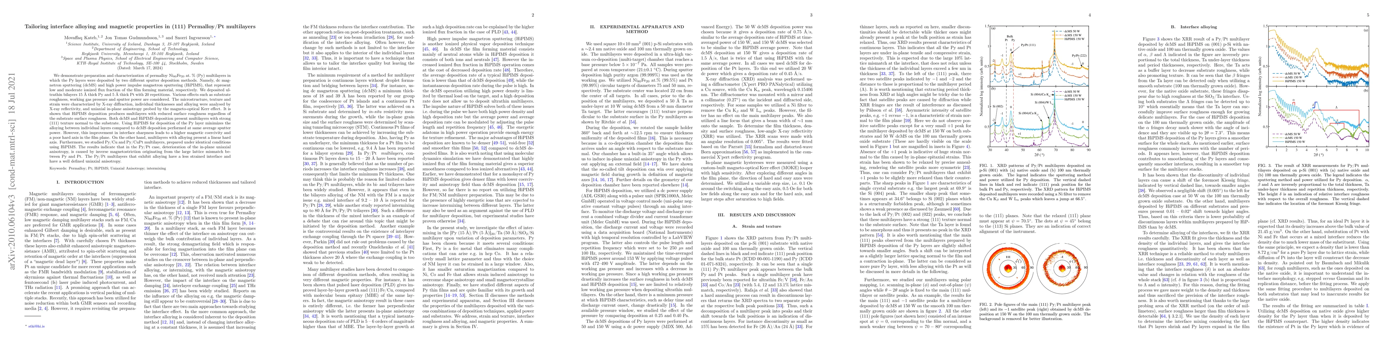 We present deposition and characterization of multilayers consisting of 20 repetitions of 15 $\r{A}$ thick permalloy Ni$_{80}$Fe$_{20}$ at. \% (Py) and 5 $\r{A}$ Pt. The samples were prepared by two different sputter deposition methods, namely dc magnetron sputtering (dcMS) and high power impulse magnetron sputtering (HiPIMS), that represent low and moderate ionized flux fraction of the film forming material, respectively, for deposition of the Py layers. The effect of substrate roughness, working gas pressure and sputter power on the in-plane uniaxial magnetic anisotropy of the films are studied. The multilayers were characterized by X-ray reflectivity and diffraction, and by magneto-optical Kerr effect (MOKE). It is shown that HiPIMS deposition produces multilayers with unique surface roughness regardless of the substrate surface roughness. Multilayers prepared by both dcMS and HiPIMS deposition present a strong (111) texture normal to the film plane. The results show that utilizing HiPIMS for deposition of the Py layer leads to a minimum interface mixing between individual layers compared to dcMS deposition performed at sputter power. This is associated with the smooth surface of Py deposited by HiPIMS. However, this sharp interface results in higher coercivity and an opening in the hard axis hysteresis loops while multilayers with intermixing present well defined in-plane uniaxial anisotropy i.e. a linear hard axis. Comparison with Py/Cu and Py/CuPt multilayers, prepared under identical conditions using HiPIMS, suggests that poor in-plane uniaxial anisotropy is obtained in the Py/Pt case, caused by the inverse magnetostriction arising from the large lattice mismatch between Py and Pt. The Py/Pt multilayers that exhibit interface mixing have a more relaxed interface and thus presents negligible inverse magnetostriction and have better defined anisotropy.