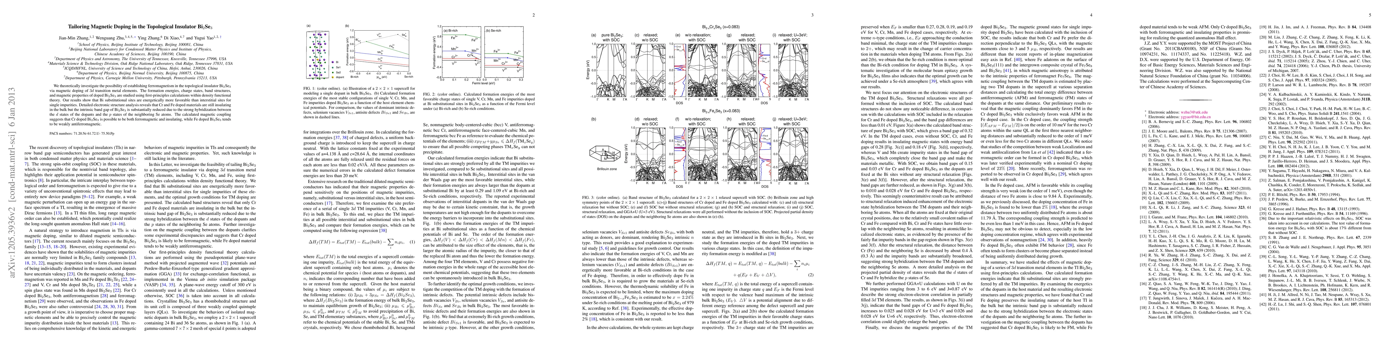 This paper explores the potential for inducing ferromagnetism in the topological insulator Bi2Se3 through magnetic doping with 3d transition metals. The study finds that Cr doping at Bi sites can yield a ferromagnetic and insulating material, while Fe doping results in weak antiferromagnetism.