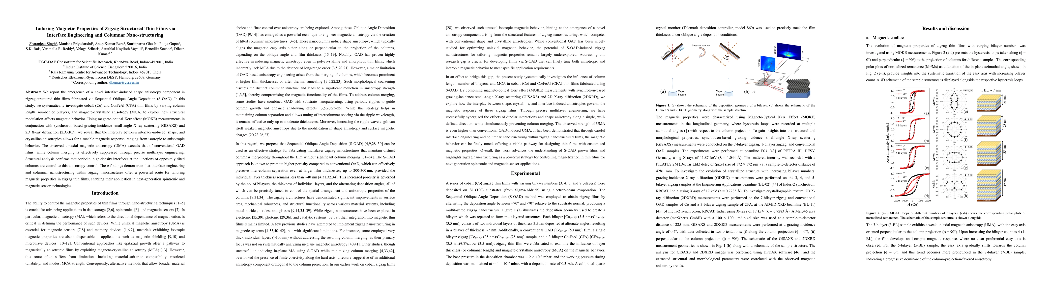 We report the emergence of a novel interface-induced shape anisotropy component in zigzag-structured thin films fabricated via Sequential Oblique Angle Deposition (S-OAD). In this study, we systematically investigate cobalt (Co) and Co2FeAl (CFA) thin films by varying column length, number of bilayers, and magneto-crystalline anisotropy (MCA) to explore how structural modulation affects magnetic behavior. Using magneto-optical Kerr effect (MOKE) measurements in conjunction with synchrotron-based grazing-incidence small-angle X-ray scattering (GISAXS) and 2D X-ray diffraction (2DXRD), we reveal that the interplay between interface-induced, shape, and crystalline anisotropies allows for a tunable magnetic response, ranging from isotropic to anisotropic behavior. The observed uniaxial magnetic anisotropy (UMA) exceeds that of conventional OAD films, while column merging is effectively suppressed through precise multilayer engineering. Structural analysis confirms that periodic, high-density interfaces at the junctions of oppositely tilted columns are central to this anisotropy control. These findings demonstrate that interface engineering and columnar nanostructuring within zigzag nanostructures offer a powerful route for tailoring magnetic properties in zigzag thin films, enabling their application in next-generation spintronic and magnetic sensor technologies.