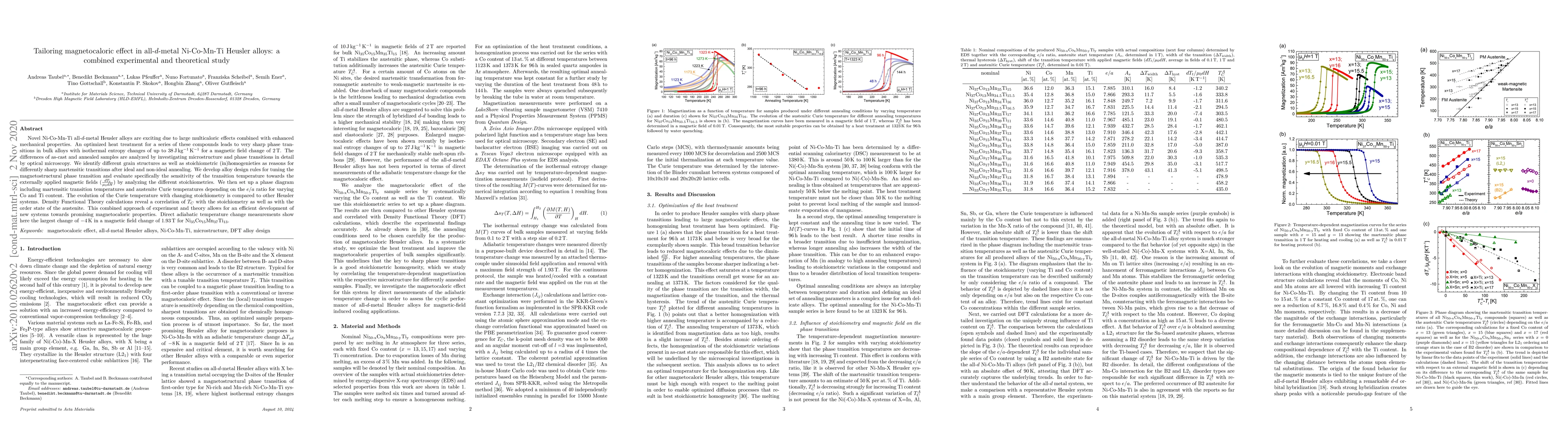 Novel Ni-Co-Mn-Ti all-d-metal Heusler alloys are exciting due to large multicaloric effects combined with enhanced mechanical properties. An optimized heat treatment for a series of these compounds leads to very sharp phase transitions in bulk alloys with isothermal entropy changes of up to 38 J kg$^{-1}$ K$^{-1}$ for a magnetic field change of 2 T. The differences of as-cast and annealed samples are analyzed by investigating microstructure and phase transitions in detail by optical microscopy. We identify different grain structures as well as stoichiometric (in)homogenieties as reasons for differently sharp martensitic transitions after ideal and non-ideal annealing. We develop alloy design rules for tuning the magnetostructural phase transition and evaluate specifically the sensitivity of the transition temperature towards the externally applied magnetic fields ($\frac{dT_t}{\mu_0dH}$) by analyzing the different stoichiometries. We then set up a phase diagram including martensitic transition temperatures and austenite Curie temperatures depending on the e/a ratio for varying Co and Ti content. The evolution of the Curie temperature with changing stoichiometry is compared to other Heusler systems. Density Functional Theory calculations reveal a correlation of T$_C$ with the stoichiometry as well as with the order state of the austenite. This combined approach of experiment and theory allows for an efficient development of new systems towards promising magnetocaloric properties. Direct adiabatic temperature change measurements show here the largest change of -4 K in a magnetic field change of 1.93 T for Ni$_{35}$Co$_{15}$Mn$_{37}$Ti$_{13}$.