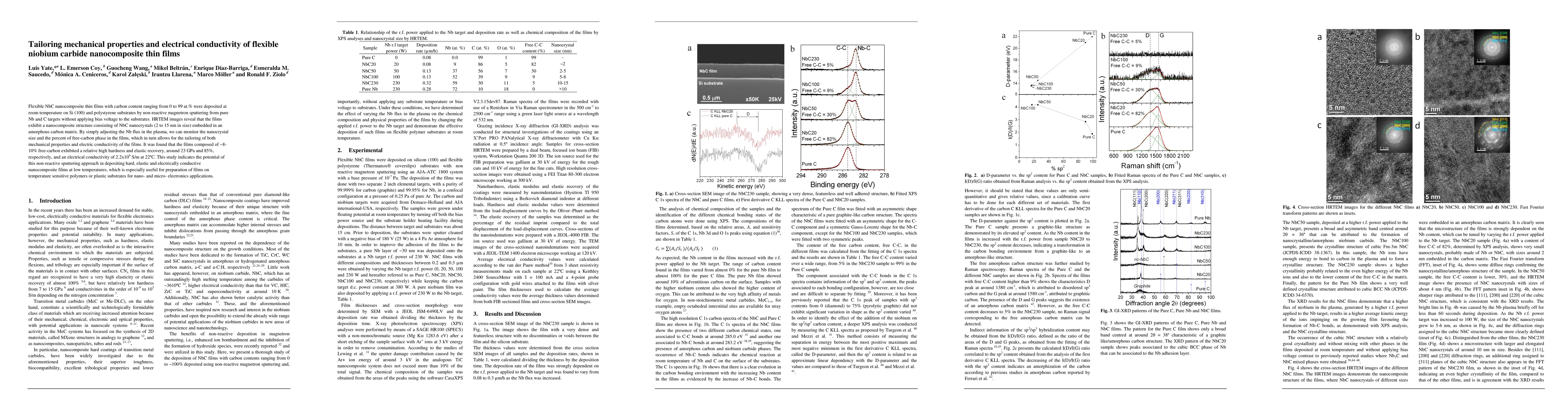 This study explores the deposition of flexible NbC nanocomposite thin films using non-reactive magnetron sputtering, revealing a tunable nanocomposite structure that allows for the adjustment of mechanical and electrical properties. Films with optimal carbon content (~8-10%) demonstrate high hardness, elastic recovery, and electrical conductivity, making them suitable for flexible electronics on temperature-sensitive substrates.