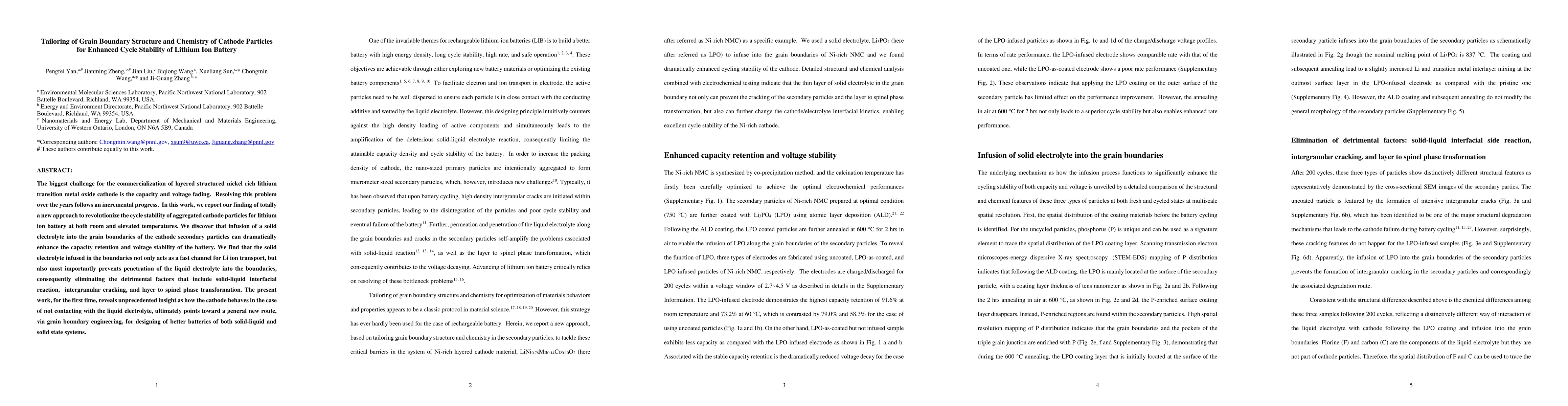 This paper proposes a novel method to enhance the cycle stability of lithium ion batteries by infusing a solid electrolyte into the grain boundaries of nickel-rich cathode particles, which improves capacity retention and voltage stability. This approach prevents liquid electrolyte penetration, thereby eliminating detrimental side reactions and structural degradation.