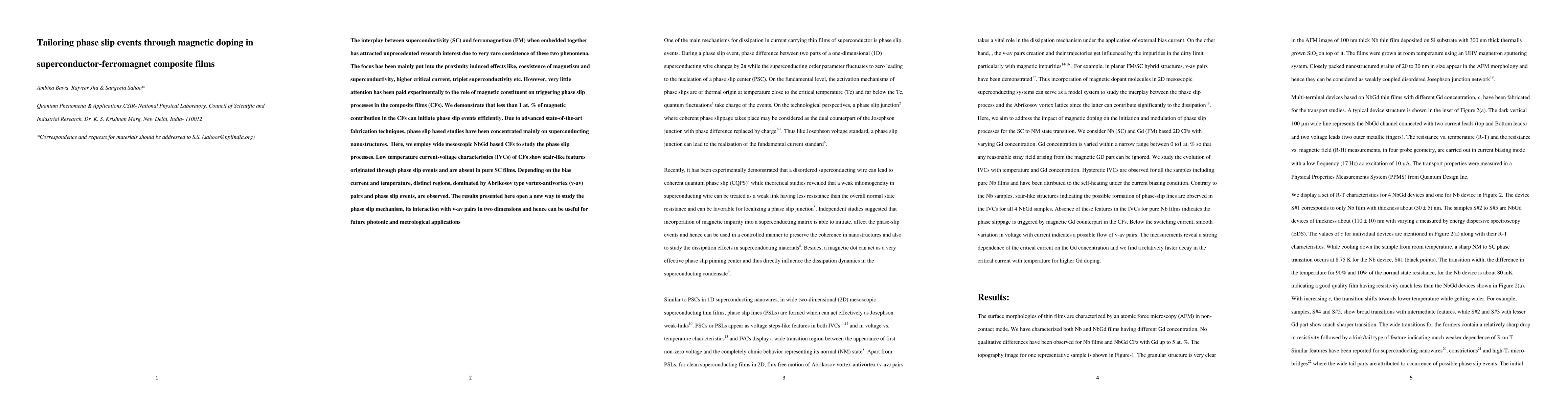 The interplay between superconductivity (SC) and ferromagnetism (FM) when embedded together has attracted unprecedented research interest due to very rare coexistence of these two phenomena. The focus has been mainly put into the proximity induced effects like, coexistence of magnetism and superconductivity, higher critical current, triplet superconductivity etc. However, very little attention has been paid experimentally to the role of magnetic constituent on triggering phase slip processes in the composite films (CFs). We demonstrate that less than 1 at. % of magnetic contribution in the CFs can initiate phase slip events efficiently. Due to advanced state-of-the-art fabrication techniques, phase slip based studies have been concentrated mainly on superconducting nanostructures. Here, we employ wide mesoscopic NbGd based CFs to study the phase slip processes. Low temperature current-voltage characteristics (IVCs) of CFs show stair-like features originated through phase slip events and are absent in pure SC films. Depending on the bias current and temperature, distinct regions, dominated by Abrikosov type vortex-antivortex (v-av) pairs and phase slip events, are observed. The results presented here open a new way to study the phase slip mechanism, its interaction with v-av pairs in two dimensions and hence can be useful for future photonic and metrological applications