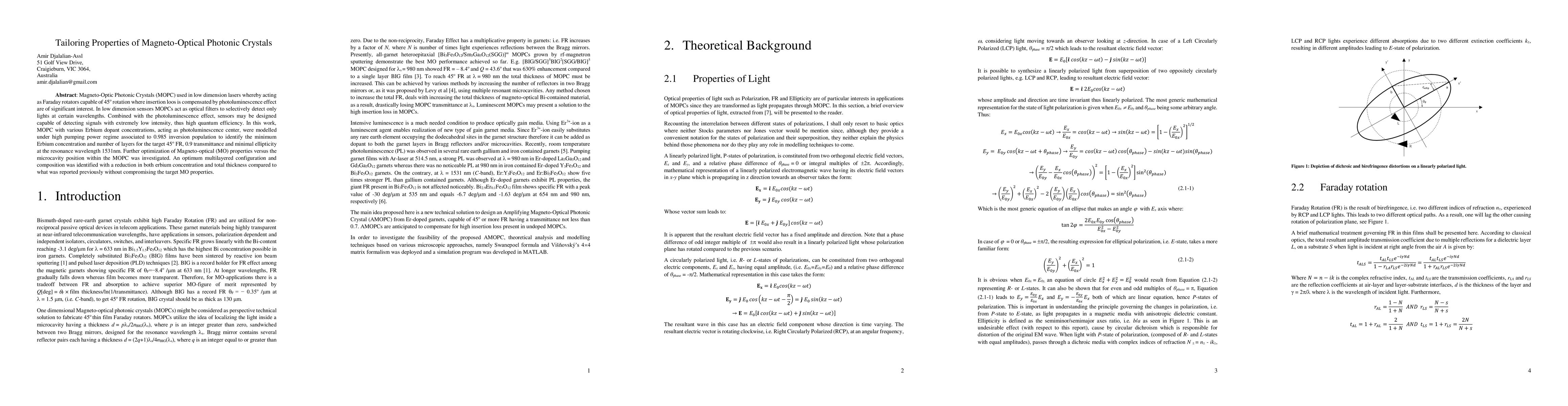 Magneto-Optic Photonic Crystals (MOPC) used in low dimension lasers whereby acting as Faraday rotators capable of 45o rotation where insertion loos is compensated by photoluminescence effect are of significant interest. In low dimension sensors MOPCs act as optical filters to selectively detect only lights at certain wavelengths. Combined with the photoluminescence effect, sensors may be designed capable of detecting signals with extremely low intensity, thus high quantum efficiency. In this work, MOPC with various Erbium dopant concentrations, acting as photoluminescence center, were modelled under high pumping power regime associated to 0.985 inversion population to identify the minimum Erbium concentration and number of layers for the target 45 degrees FR, 0.9 transmittance and minimal ellipticity at the resonance wavelength 1531nm. Further optimization of Magneto-optical (MO) properties versus the microcavity position within the MOPC was investigated. An optimum multilayered configuration and composition was identified with a reduction in both erbium concentration and total thickness compared to what was reported previously without compromising the target MO properties.
