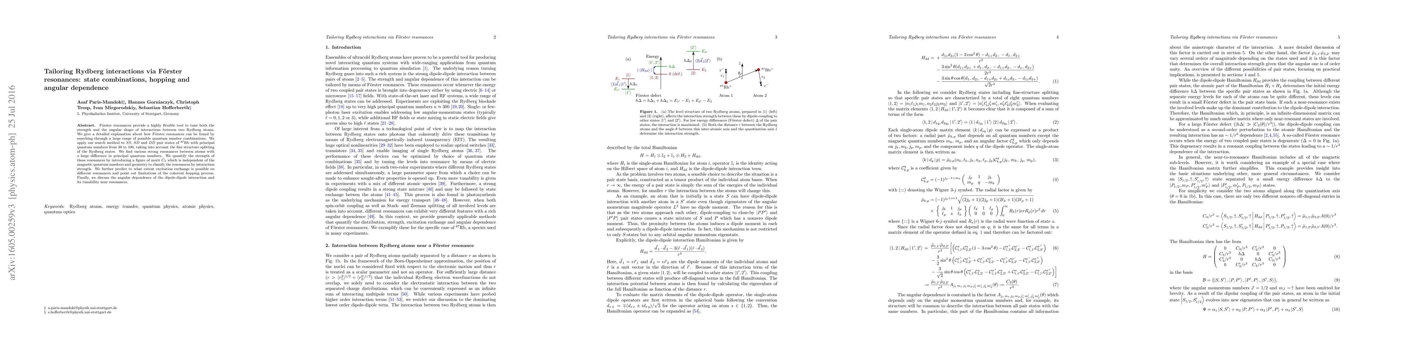 This paper explores how F\"orster resonances enable precise tuning of Rydberg atom interactions by examining various quantum number combinations and their angular dependence. The study identifies strong resonances for $^{87}$Rb atoms, introduces a figure of merit to classify interaction strengths, and discusses the limitations of coherent hopping and the tunability of the interaction's angular shape.