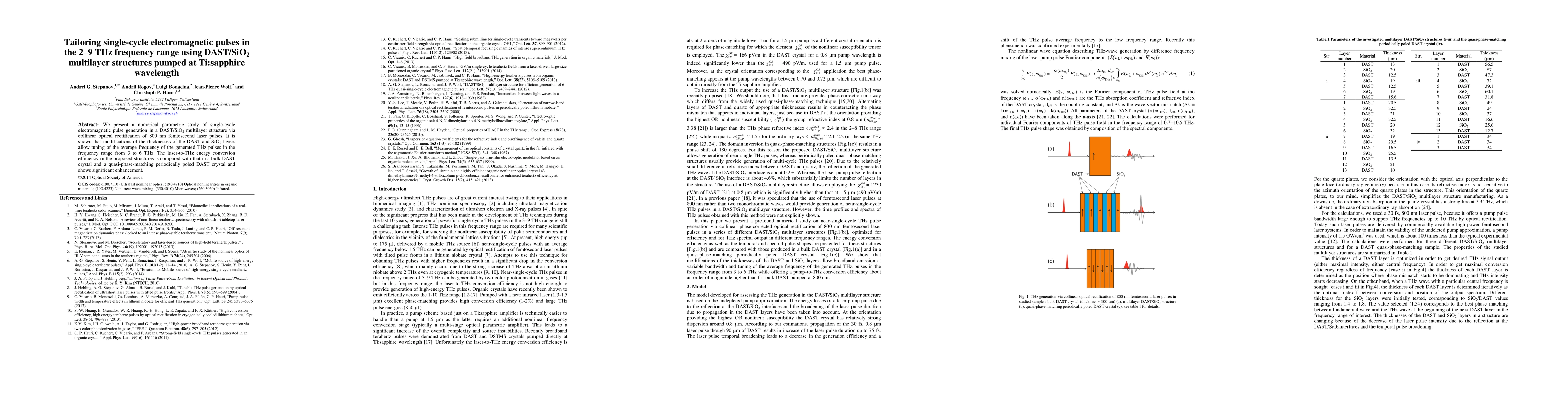 This paper explores the generation of single-cycle electromagnetic pulses in the 2-9 THz range using DAST/SiO2 multilayer structures, demonstrating that adjusting layer thicknesses tunes the average frequency to 3-6 THz. The study finds that these structures significantly enhance laser-to-THz energy conversion efficiency compared to bulk DAST and periodically poled DAST crystals.