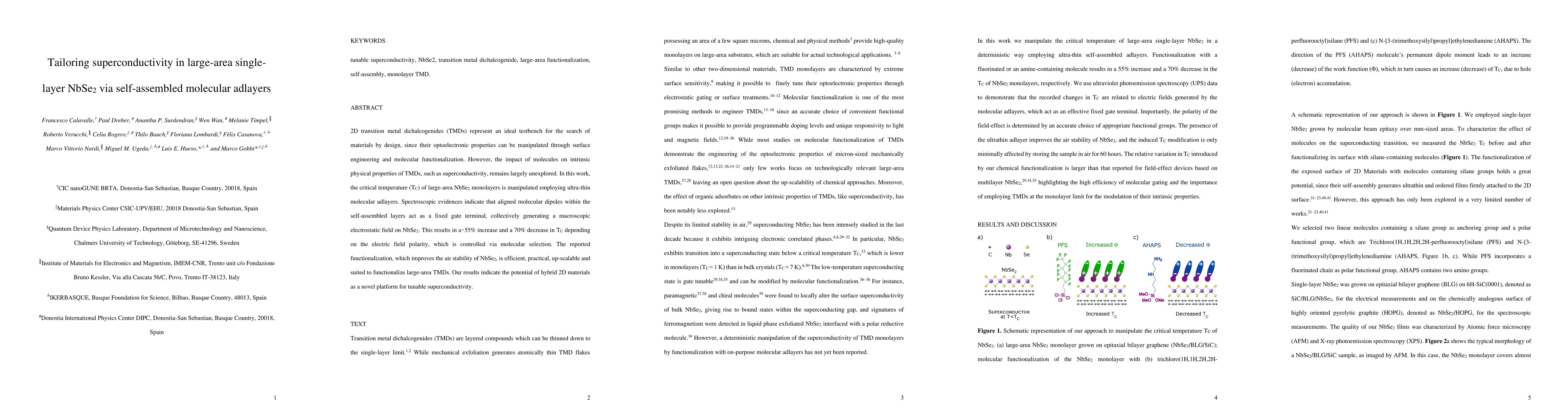 Two-dimensional transition metal dichalcogenides (TMDs) represent an ideal testbench for the search of materials by design, because their optoelectronic properties can be manipulated through surface engineering and molecular functionalization. However, the impact of molecules on intrinsic physical properties of TMDs, such as superconductivity, remains largely unexplored. In this work, the critical temperature (TC) of large-area NbSe2 monolayers is manipulated, employing ultrathin molecular adlayers. Spectroscopic evidence indicates that aligned molecular dipoles within the self-assembled layers act as a fixed gate terminal, collectively generating a macroscopic electrostatic field on NbSe2. This results in an \sim 55\% increase and a 70\% decrease in TC depending on the electric field polarity, which is controlled via molecular selection. The reported functionalization, which improves the air stability of NbSe2, is efficient, practical, up-scalable, and suited to functionalize large-area TMDs. Our results indicate the potential of hybrid 2D materials as a novel platform for tunable superconductivity.