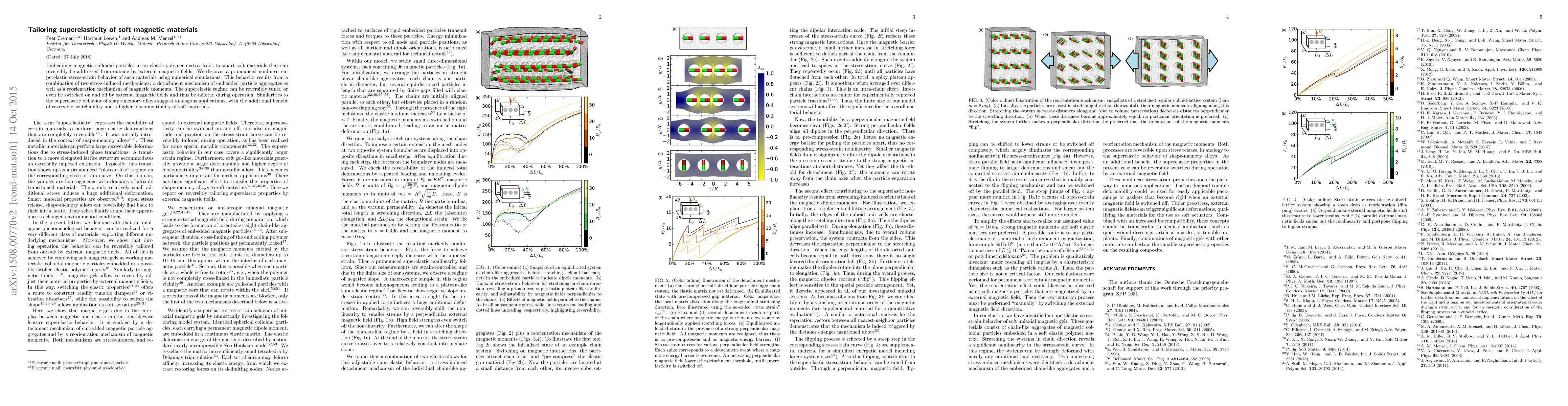 Embedding magnetic colloidal particles in an elastic polymer matrix leads to smart soft materials that can reversibly be addressed from outside by external magnetic fields. We discover a pronounced nonlinear superelastic stress-strain behavior of such materials using numerical simulations. This behavior results from a combination of two stress-induced mechanisms: a detachment mechanism of embedded particle aggregates as well as a reorientation mechanism of magnetic moments. The superelastic regime can be reversibly tuned or even be switched on and off by external magnetic fields and thus be tailored during operation. Similarities to the superelastic behavior of shape-memory alloys suggest analogous applications, with the additional benefit of reversible switchability and a higher biocompatibility of soft materials.