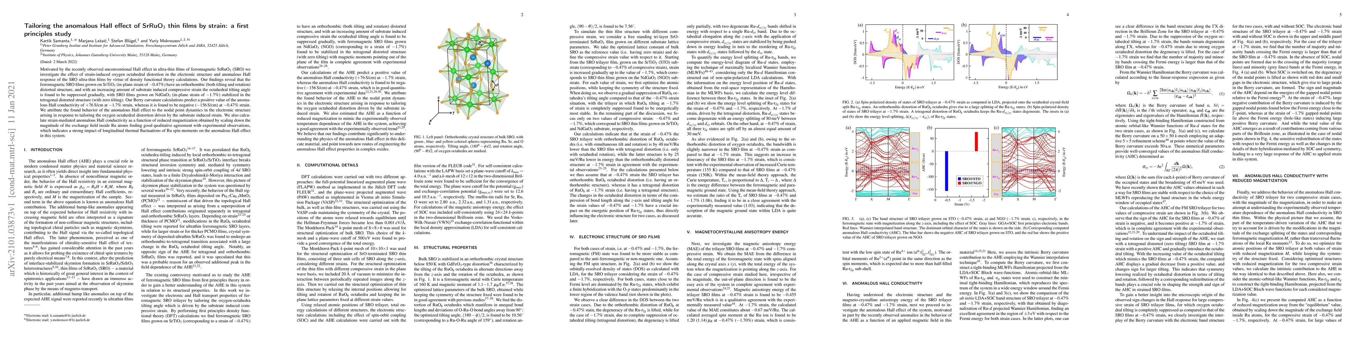 This study uses density functional theory to explore how strain affects the anomalous Hall effect in ultra-thin ferromagnetic SrRuO$_3$ films. The research finds that substrate-induced strain alters the oxygen octahedral distortion, leading to different anomalous Hall conductivities, with a positive value of +76 S/cm at higher strain and a negative value of -156 S/cm at lower strain.