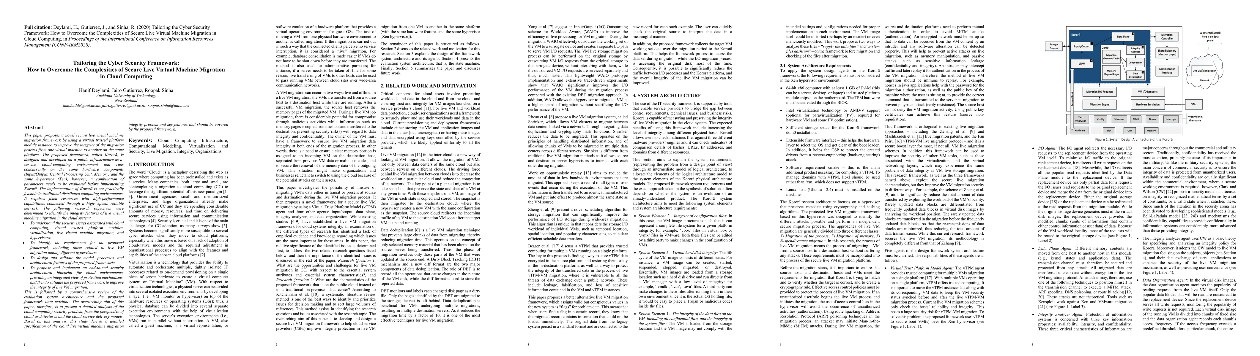 This paper proposes a novel secure live virtual machine migration framework by using a virtual trusted platform module instance to improve the integrity of the migration process from one virtual machine to another on the same platform. The proposed framework, called Koror\=a, is designed and developed on a public infrastructure-as-a-service cloud-computing environment and runs concurrently on the same hardware components (Input/Output, Central Processing Unit, Memory) and the same hypervisor (Xen); however, a combination of parameters needs to be evaluated before implementing Koror\=a. The implementation of Koror\=a is not practically feasible in traditional distributed computing environments. It requires fixed resources with high-performance capabilities, connected through a high-speed, reliable network. The following research objectives were determined to identify the integrity features of live virtual machine migration in the cloud system: To understand the security issues associated with cloud computing, virtual trusted platform modules, virtualization, live virtual machine migration, and hypervisors; To identify the requirements for the proposed framework, including those related to live VM migration among different hypervisors; To design and validate the model, processes, and architectural features of the proposed framework; To propose and implement an end-to-end security architectural blueprint for cloud environments, providing an integrated view of protection mechanisms, and then to validate the proposed framework to improve the integrity of live VM migration. This is followed by a comprehensive review of the evaluation system architecture and the proposed framework state machine. The overarching aim of this paper, therefore, is to present a detailed analysis of the cloud computing security problem, from the perspective of cloud architectures and the cloud... [Abridged]