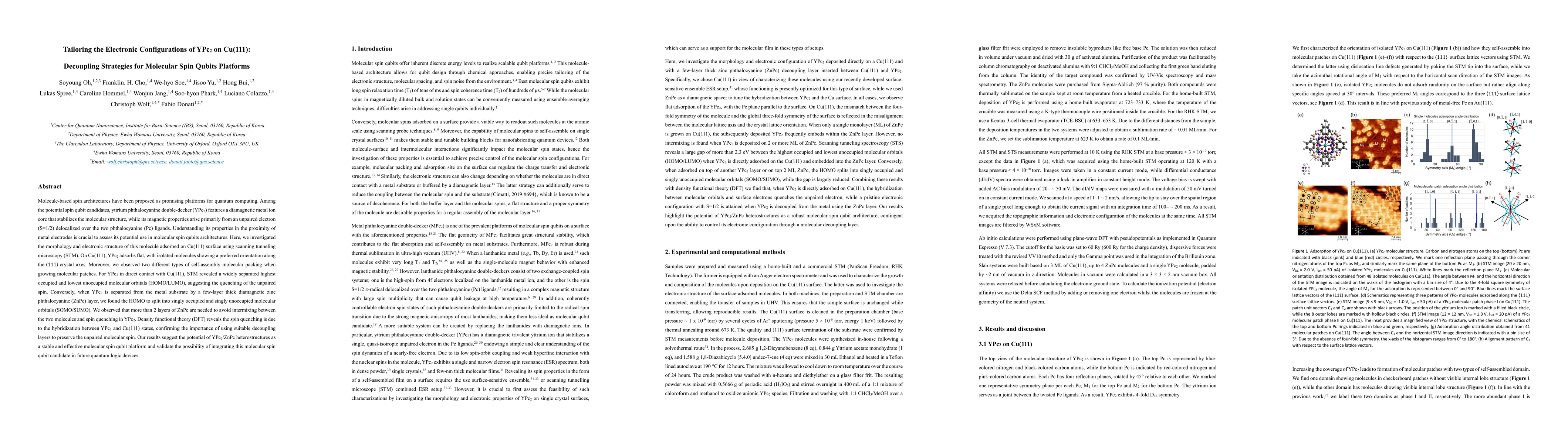 The paper presents a detailed analysis of YPc2 electronic configurations on Cu(111) and the role of decoupling layers (ZnPc) in preserving molecular spins, crucial for spin-based qubits.