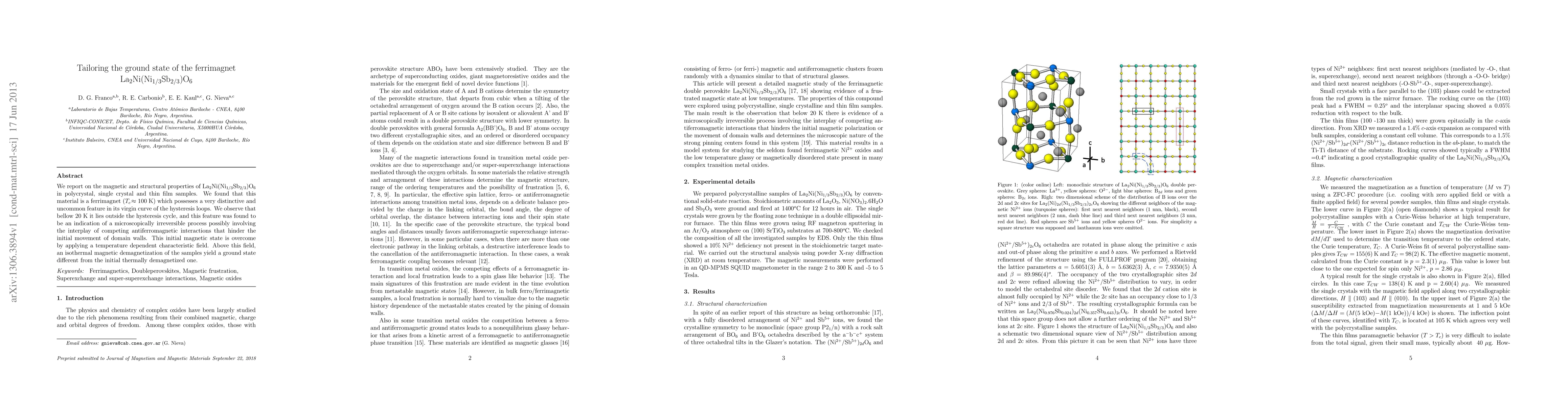 Researchers studied La2Ni(Ni1/3Sb2/3)O6 and found it to be a ferrimagnet with unique properties, including a ground state that changes when an external field is applied. The material's magnetic behavior is influenced by competing antiferromagnetic interactions.