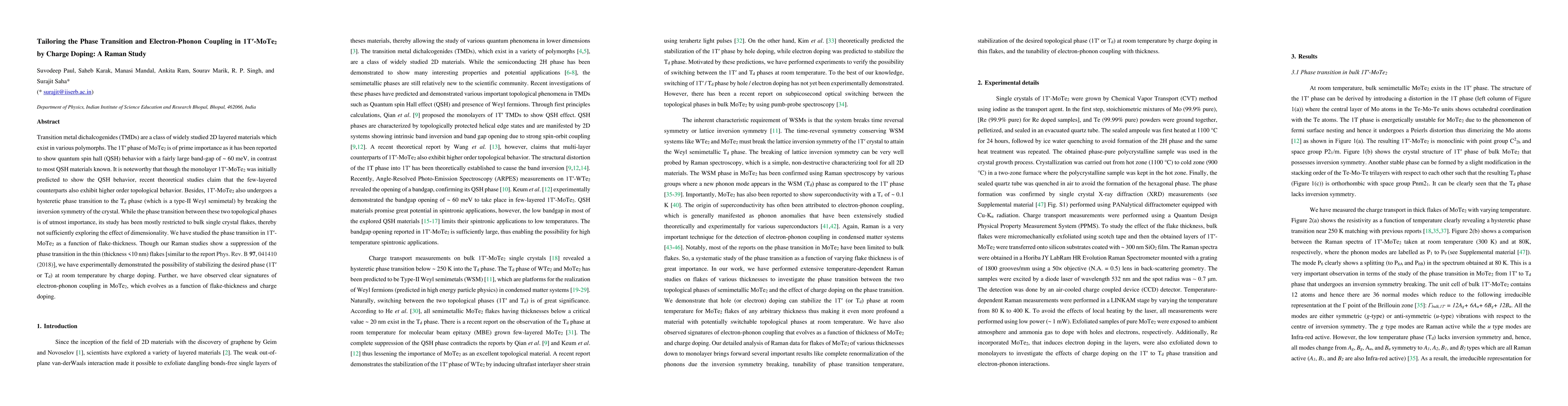 Transition metal dichalcogenides (TMDs) are a class of widely studied 2D layered materials which exist in various polymorphs. The 1T' phase of MoTe2 is of prime importance as it has been reported to show quantum spin hall (QSH) behavior with a fairly large band-gap of ~ 60 meV, in contrast to most QSH materials known. It is noteworthy that though the monolayer 1T'-MoTe2 was initially predicted to show the QSH behavior, recent theoretical studies claim that the few-layered counterparts also exhibit higher order topological behavior. Besides, 1T'-MoTe2 also undergoes a hysteretic phase transition to the Td phase (which is a type-II Weyl semimetal) by breaking the inversion symmetry of the crystal. While the phase transition between these two topological phases is of utmost importance, its study has been mostly restricted to bulk single crystal flakes, thereby not sufficiently exploring the effect of dimensionality. We have studied the phase transition in 1T'-MoTe2 as a function of flake-thickness. Though our Raman studies show a suppression of the phase transition in the thin (thickness <10 nm) flakes [similar to the report Phys. Rev. B 97, 041410 (2018)], we have experimentally demonstrated the possibility of stabilizing the desired phase (1T' or Td) at room temperature by charge doping. Further, we have observed clear signatures of electron-phonon coupling in MoTe2, which evolves as a function of flake-thickness and charge doping.