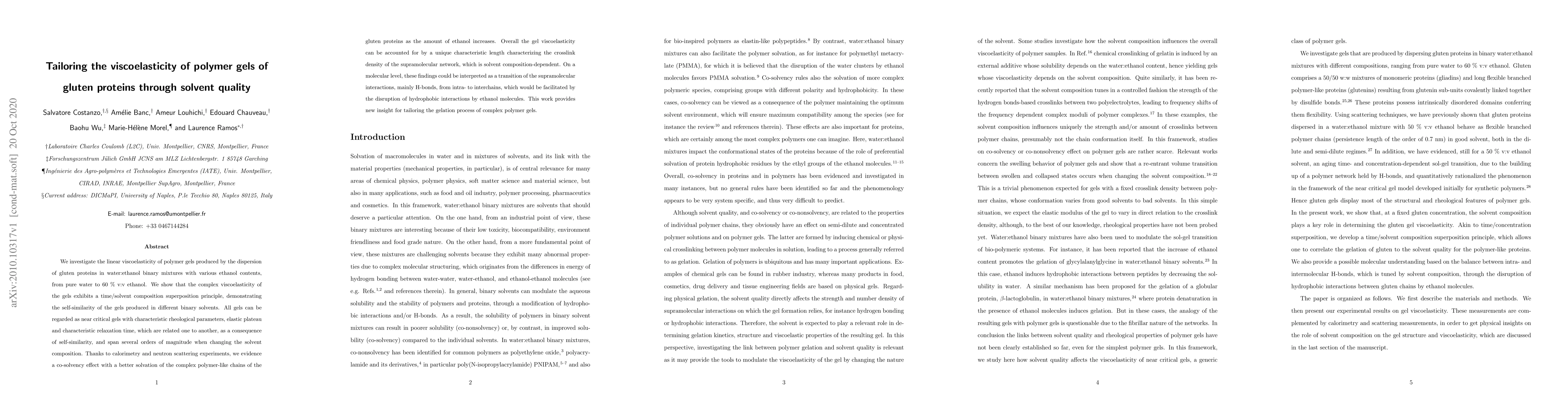 This study explores how varying ethanol content in water:ethanol mixtures affects the viscoelasticity of gluten protein gels, revealing a self-similarity across different solvent compositions. The research highlights a transition in supramolecular interactions, primarily hydrogen bonds, influenced by ethanol, which can tailor the gelation process.