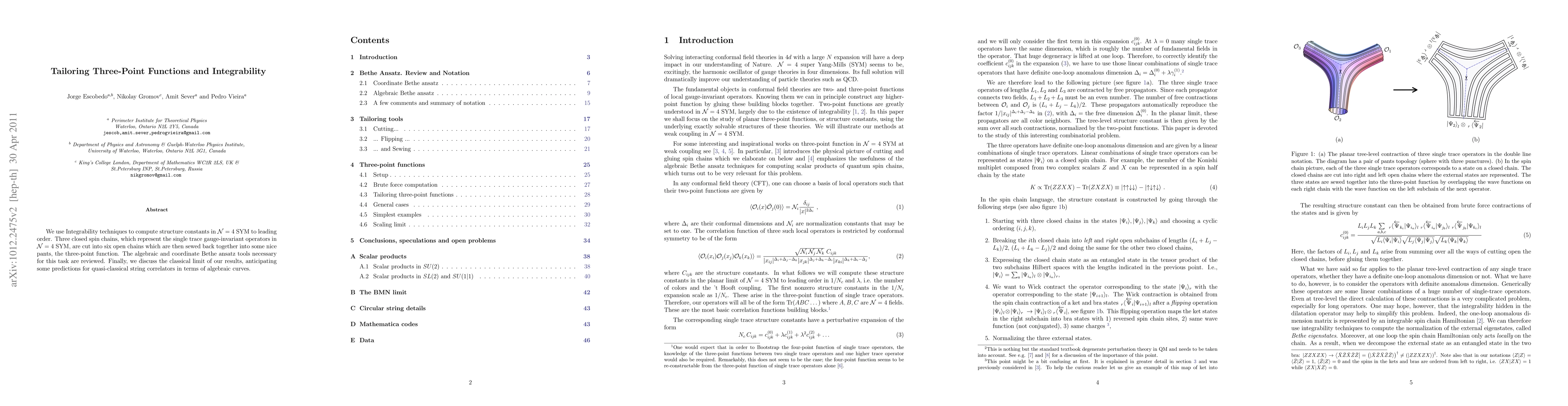 We use Integrability techniques to compute structure constants in N=4 SYM to leading order. Three closed spin chains, which represent the single trace gauge-invariant operators in N=4 SYM, are cut into six open chains which are then sewed back together into some nice pants, the three-point function. The algebraic and coordinate Bethe ansatz tools necessary for this task are reviewed. Finally, we discuss the classical limit of our results, anticipating some predictions for quasi-classical string correlators in terms of algebraic curves.