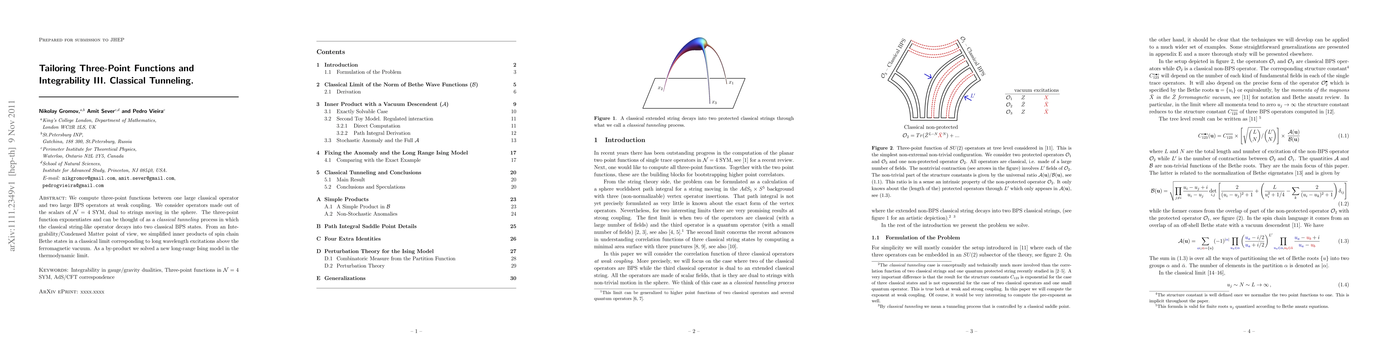 This paper computes three-point functions in N=4 SYM at weak coupling, revealing an exponentiated classical tunneling process where a large classical operator decays into two BPS states. It also simplifies inner products of spin chain Bethe states in a classical limit, solving a new long-range Ising model.