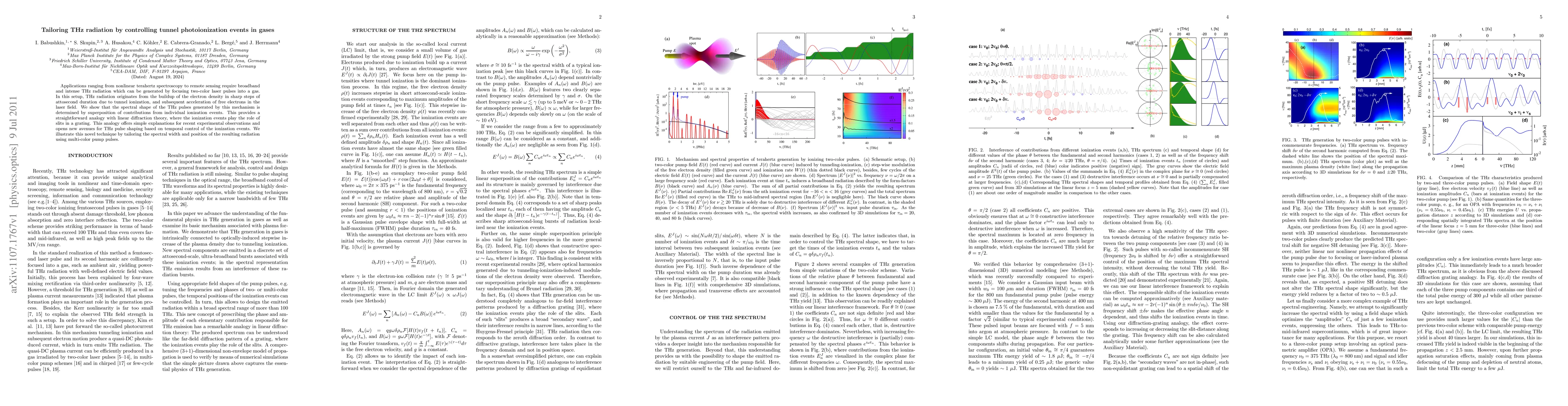 This paper explores generating and shaping broadband THz radiation through controlled tunnel photoionization in gases, demonstrating that the spectral characteristics of the THz pulses are determined by the superposition of individual ionization events, analogous to linear diffraction. The authors illustrate a new method for tailoring THz pulses by manipulating the timing of these ionization events using multi-color laser pulses.
