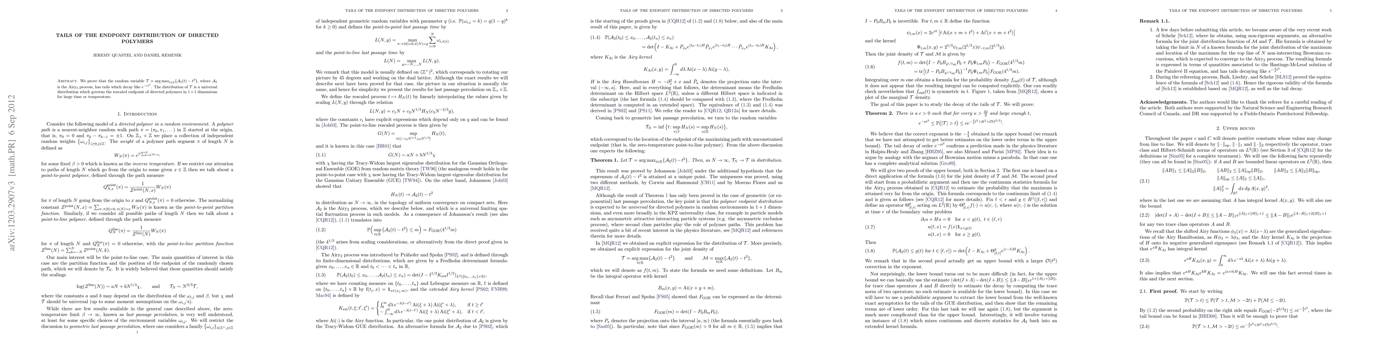 This paper demonstrates that the endpoint of directed polymers in 1+1 dimensions follows a universal distribution with tails that decay exponentially fast, specifically as $e^{-ct^3}$ as time or temperature increases. This distribution governs the behavior of the rescaled endpoint for large scales.