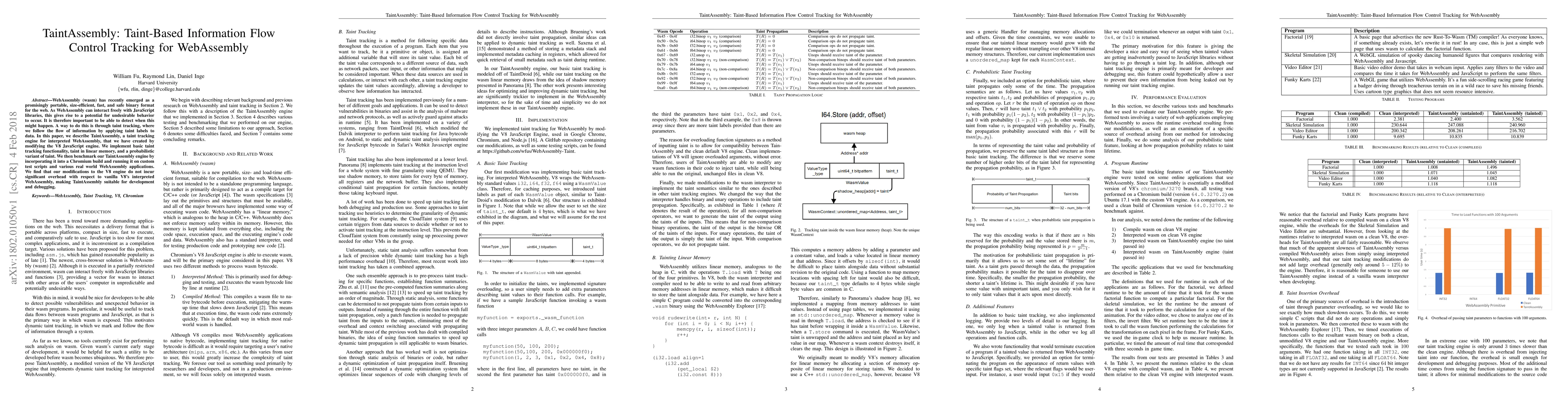 A modified version of the V8 JavaScript Engine was used to implement dynamic taint tracking for interpreted WebAssembly.