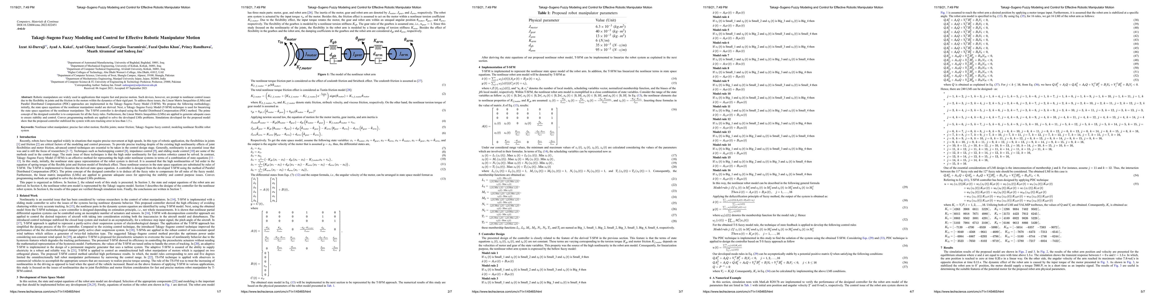 This paper proposes a Takagi-Sugeno Fuzzy Modeling and Control approach for robotic manipulators to address nonlinear control issues. The methodology involves deriving state space equations, linearizing them using T-SFM, and developing a PDC controller with LMIs to ensure stability and control, achieving zero tracking error in under 1.5 seconds.
