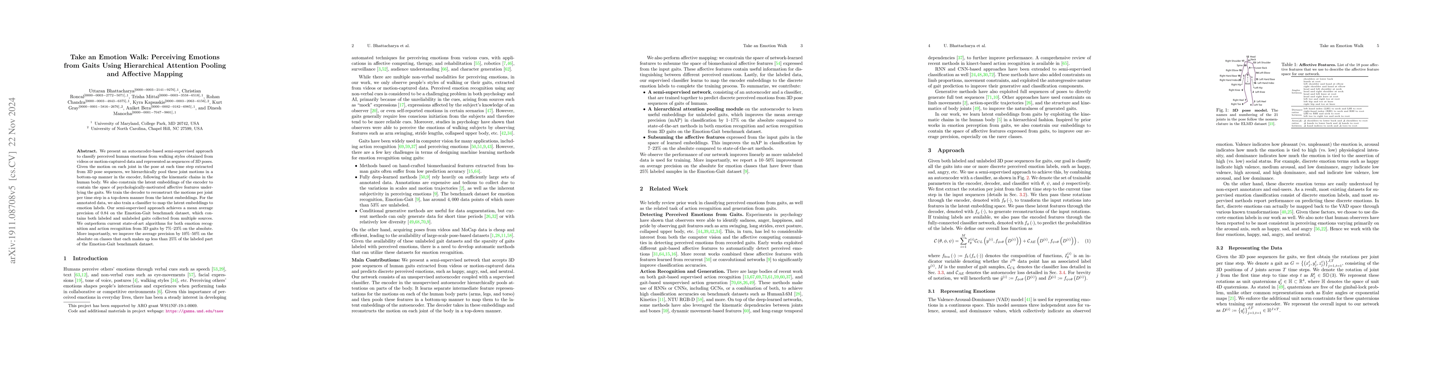 This paper proposes a semi-supervised autoencoder approach to classify human emotions from gaits using hierarchical attention pooling and affective mapping, achieving superior performance over current state-of-the-art methods, especially for underrepresented emotion classes.
