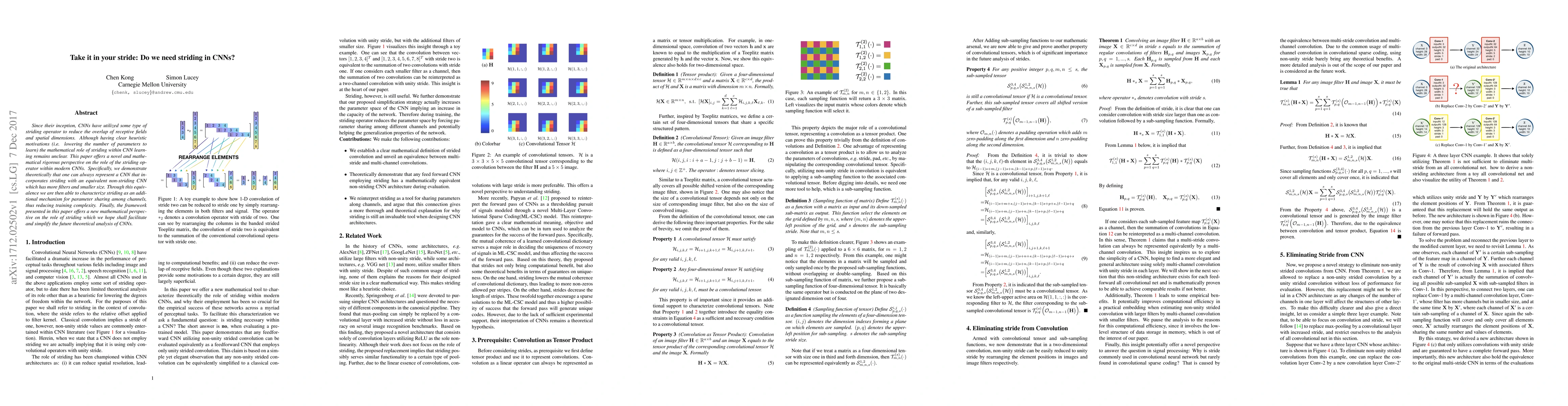The paper presents a mathematical analysis of Convolutional Neural Networks (CNNs) to understand the role of striding, proposing an equivalence between striding and parameter sharing among channels.