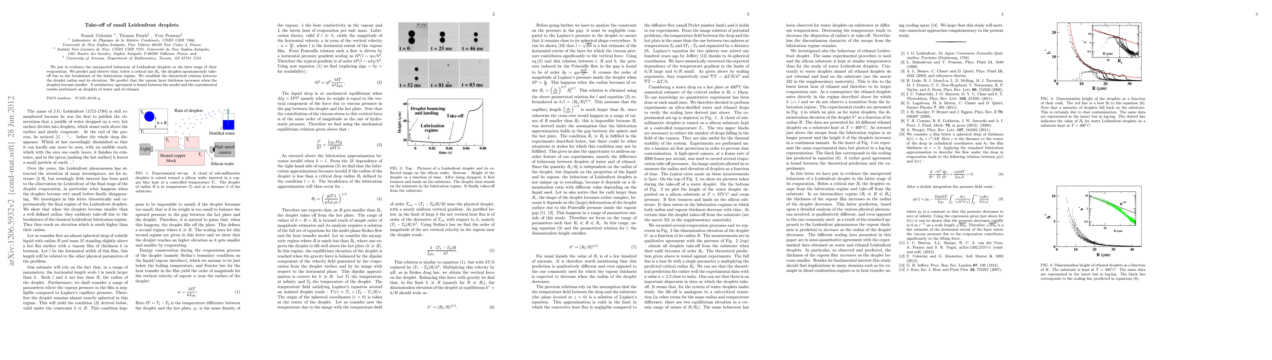 This paper investigates the surprising take-off behavior of small Leidenfrost droplets during evaporation, predicting that below a critical size, they spontaneously lift off due to the breakdown of the lubrication regime. The theoretical model correlates droplet radius with elevation, showing that the vapour layer thickens as droplets become smaller, with good agreement between model and experiments on water and ethanol droplets.