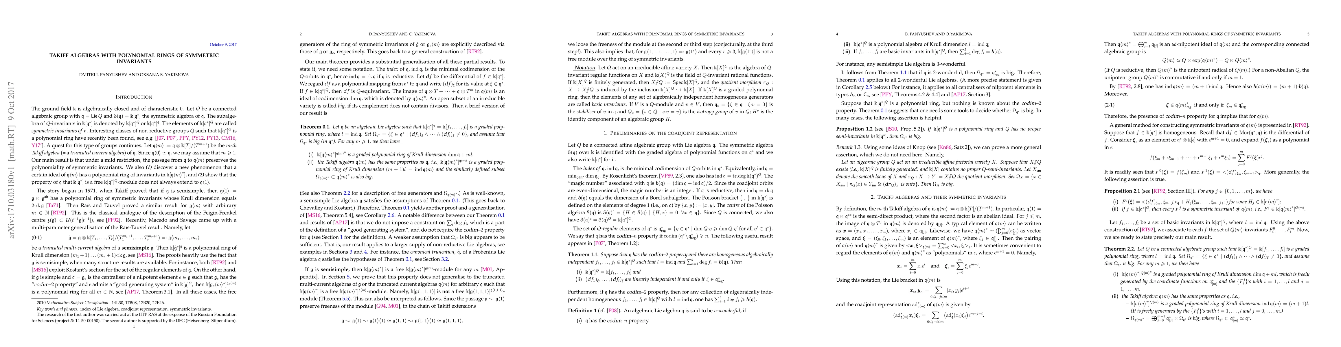 Extending results of Rais-Tauvel, Macedo-Savage, and Arakawa-Premet, we prove that under mild restrictions on the Lie algebra $\mathfrak q$ having the polynomial ring of symmetric invariants, the m-th Takiff algebra of $\mathfrak q$, $\mathfrak q\langle m\rangle$, also has a polynomial ring of symmetric invariants.