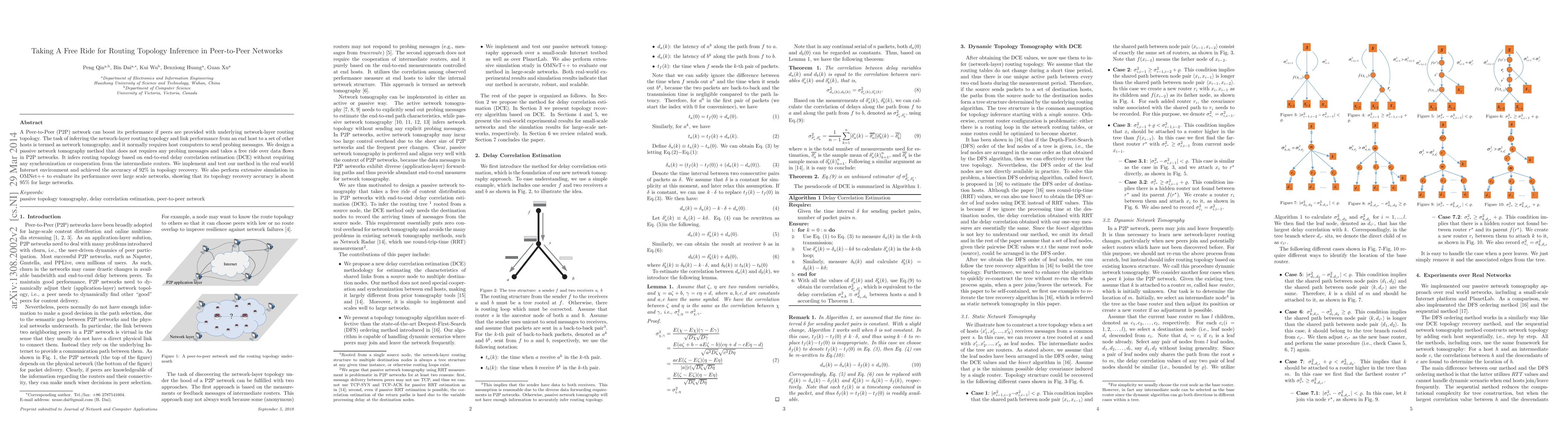 This paper proposes a passive network tomography method for inferring routing topology in P2P networks without requiring probing messages, achieving 92% accuracy in real-world tests and 95% in large-scale simulations. The method leverages end-to-end delay correlation estimation based on existing data flows.