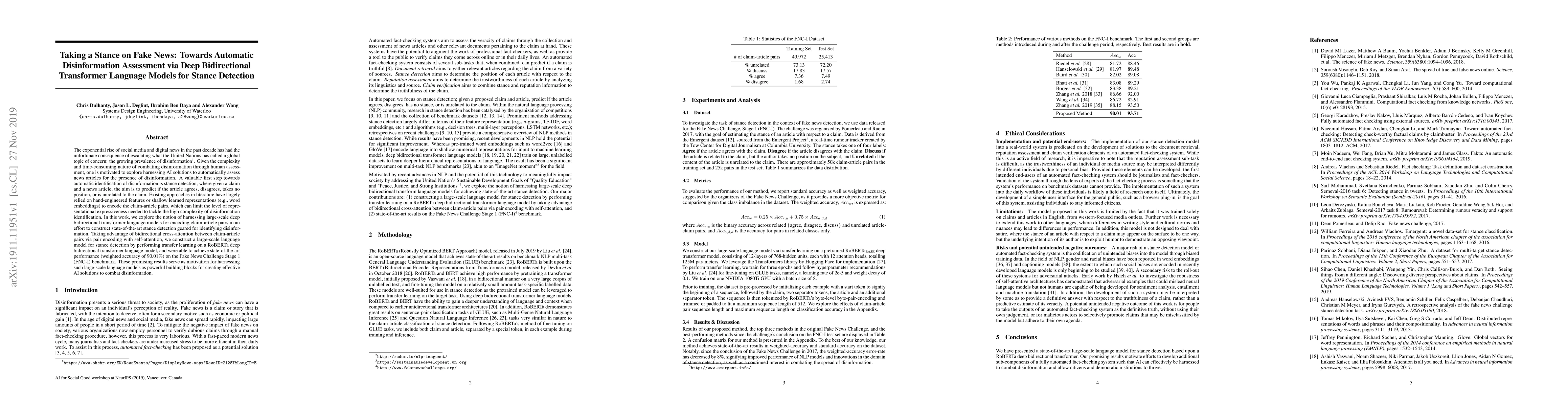 The exponential rise of social media and digital news in the past decade has had the unfortunate consequence of escalating what the United Nations has called a global topic of concern: the growing prevalence of disinformation. Given the complexity and time-consuming nature of combating disinformation through human assessment, one is motivated to explore harnessing AI solutions to automatically assess news articles for the presence of disinformation. A valuable first step towards automatic identification of disinformation is stance detection, where given a claim and a news article, the aim is to predict if the article agrees, disagrees, takes no position, or is unrelated to the claim. Existing approaches in literature have largely relied on hand-engineered features or shallow learned representations (e.g., word embeddings) to encode the claim-article pairs, which can limit the level of representational expressiveness needed to tackle the high complexity of disinformation identification. In this work, we explore the notion of harnessing large-scale deep bidirectional transformer language models for encoding claim-article pairs in an effort to construct state-of-the-art stance detection geared for identifying disinformation. Taking advantage of bidirectional cross-attention between claim-article pairs via pair encoding with self-attention, we construct a large-scale language model for stance detection by performing transfer learning on a RoBERTa deep bidirectional transformer language model, and were able to achieve state-of-the-art performance (weighted accuracy of 90.01%) on the Fake News Challenge Stage 1 (FNC-I) benchmark. These promising results serve as motivation for harnessing such large-scale language models as powerful building blocks for creating effective AI solutions to combat disinformation.
