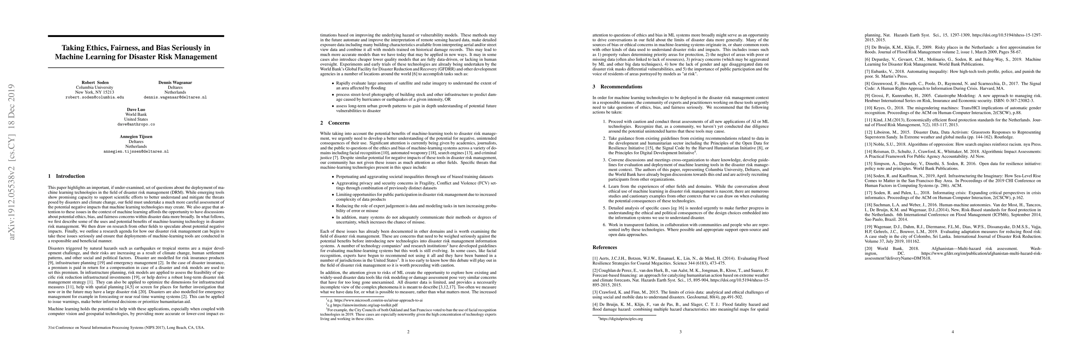 This paper highlights an important, if under-examined, set of questions about the deployment of machine learning technologies in the field of disaster risk management (DRM). While emerging tools show promising capacity to support scientific efforts to better understand and mitigate the threats posed by disasters and climate change, our field must undertake a much more careful assessment of the potential negative impacts that machine learning technologies may create. We also argue that attention to these issues in the context of machine learning affords the opportunity to have discussions about potential ethics, bias, and fairness concerns within disaster data more broadly. In what follows, we first describe some of the uses and potential benefits of machine-learning technology in disaster risk management. We then draw on research from other fields to speculate about potential negative impacts. Finally, we outline a research agenda for how our disaster risk management can begin to take these issues seriously and ensure that deployments of machine-learning tools are conducted in a responsible and beneficial manner.