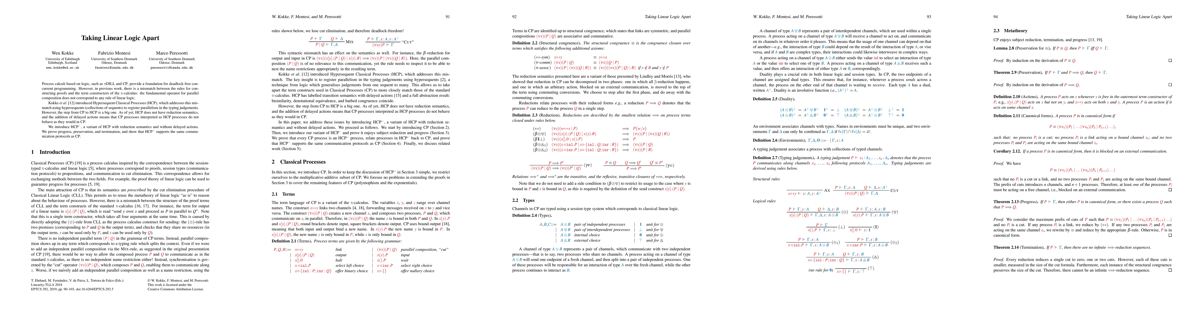 Process calculi based on logic, such as $\pi$DILL and CP, provide a foundation for deadlock-free concurrent programming. However, in previous work, there is a mismatch between the rules for constructing proofs and the term constructors of the $\pi$-calculus: the fundamental operator for parallel composition does not correspond to any rule of linear logic. Kokke et al. (2019) introduced Hypersequent Classical Processes (HCP), which addresses this mismatch using hypersequents (collections of sequents) to register parallelism in the typing judgements. However, the step from CP to HCP is a big one. As of yet, HCP does not have reduction semantics, and the addition of delayed actions means that CP processes interpreted as HCP processes do not behave as they would in CP. We introduce HCP-, a variant of HCP with reduction semantics and without delayed actions. We prove progress, preservation, and termination, and show that HCP- supports the same communication protocols as CP.