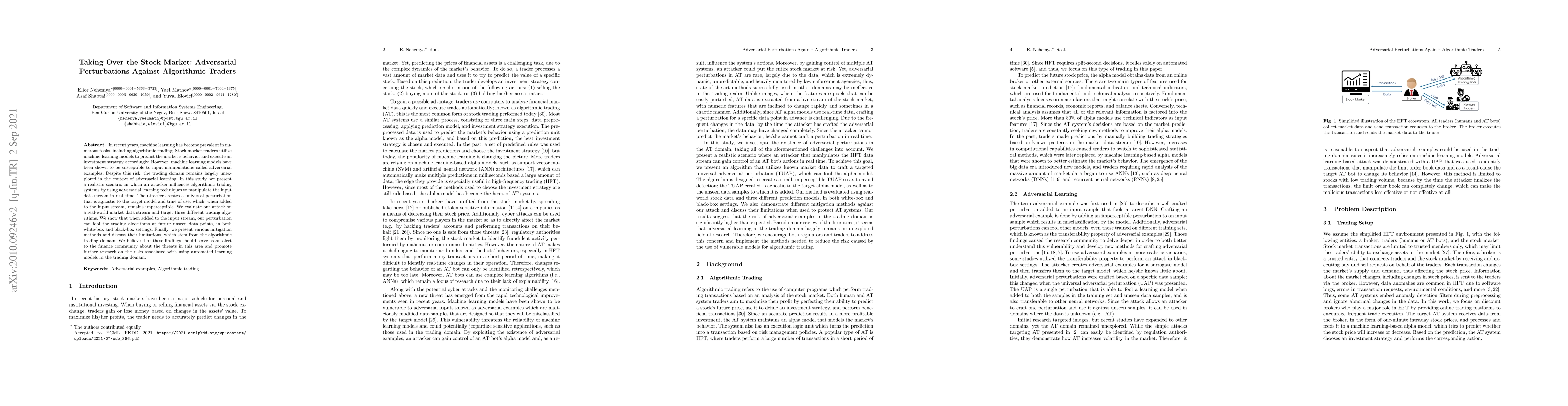 This research demonstrates how an attacker can use adversarial learning techniques to manipulate real-time market data, fooling algorithmic trading systems. The study evaluates the effectiveness of such attacks on three different trading algorithms and discusses potential mitigation methods, highlighting the need for increased awareness and research in this area.