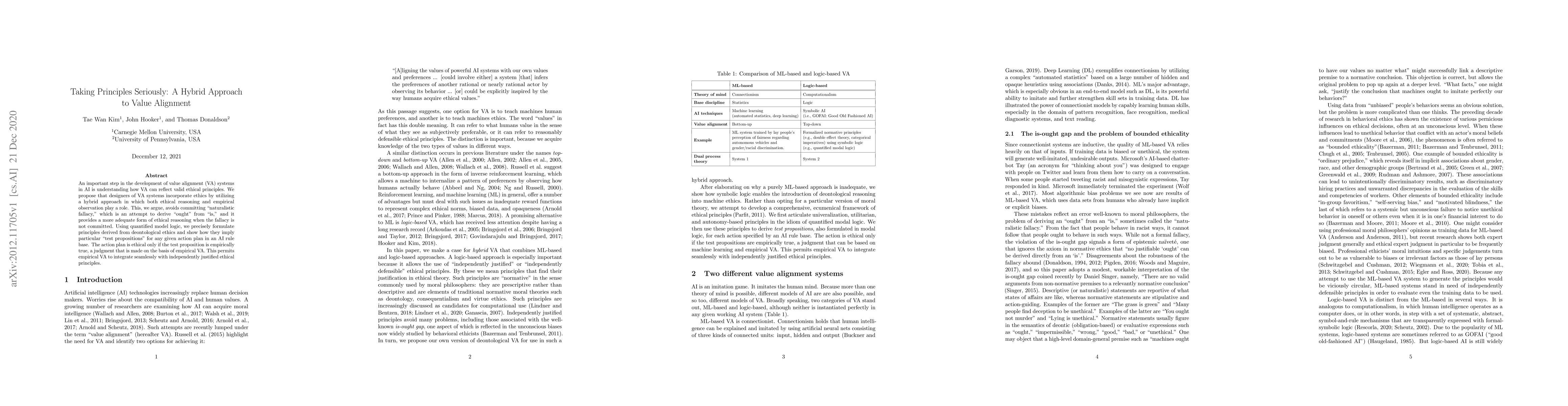 An important step in the development of value alignment (VA) systems in AI is understanding how VA can reflect valid ethical principles. We propose that designers of VA systems incorporate ethics by utilizing a hybrid approach in which both ethical reasoning and empirical observation play a role. This, we argue, avoids committing the "naturalistic fallacy," which is an attempt to derive "ought" from "is," and it provides a more adequate form of ethical reasoning when the fallacy is not committed. Using quantified model logic, we precisely formulate principles derived from deontological ethics and show how they imply particular "test propositions" for any given action plan in an AI rule base. The action plan is ethical only if the test proposition is empirically true, a judgment that is made on the basis of empirical VA. This permits empirical VA to integrate seamlessly with independently justified ethical principles.