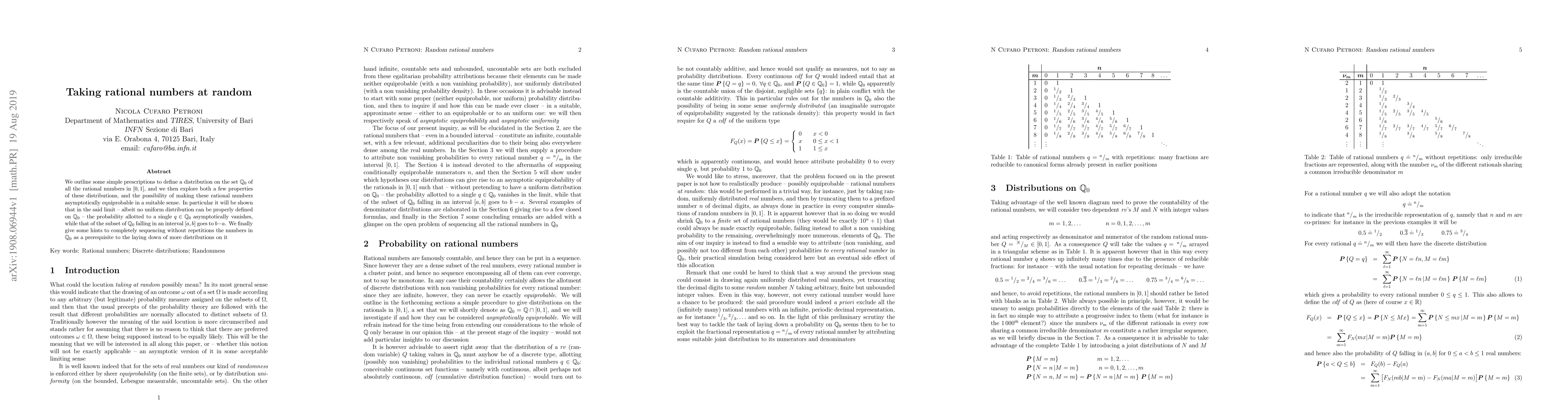 We outline some simple prescriptions to define a distribution on the set $\mathbb{Q}_0$ of all the rational numbers in $[0,1]$, and we then explore both a few properties of these distributions, and the possibility of making these rational numbers asymptotically equiprobable in a suitable sense. In particular it will be shown that in the said limit -- albeit no uniform distribution can be properly defined on $\mathbb{Q}_0$ -- the probability allotted to a single $q\in\mathbb{Q}_0$ asymptotically vanishes, while that of the subset of $\mathbb{Q}_0$ falling in an interval $[a,b]$ goes to $b-a$. We finally give some hints to completely sequencing without repetitions the numbers in $\mathbb{Q}_0$ as a prerequisite to the laying down of more distributions on it