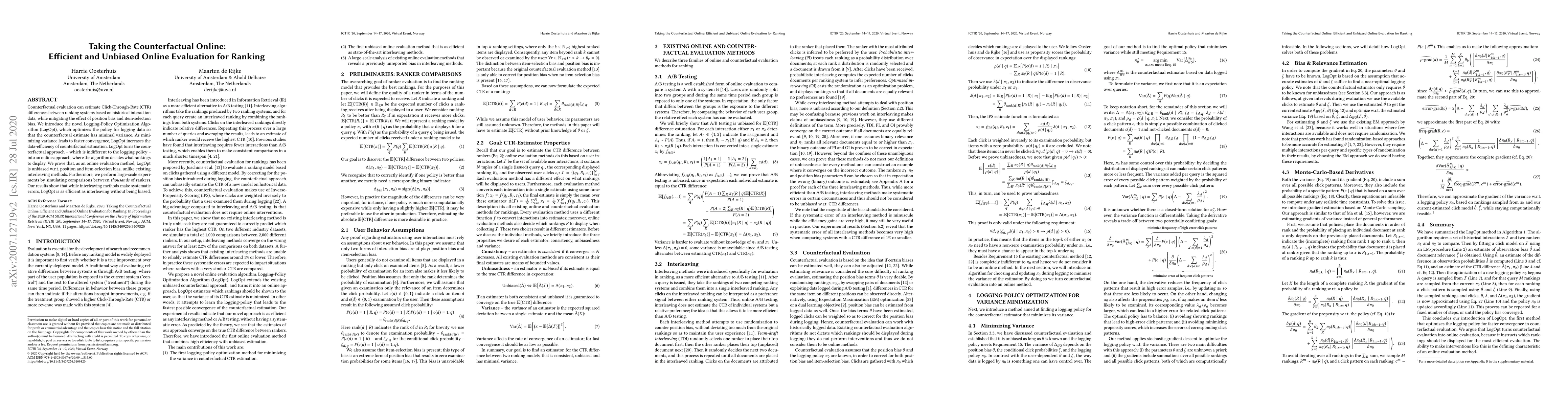 Counterfactual evaluation can estimate Click-Through-Rate (CTR) differences between ranking systems based on historical interaction data, while mitigating the effect of position bias and item-selection bias. We introduce the novel Logging-Policy Optimization Algorithm (LogOpt), which optimizes the policy for logging data so that the counterfactual estimate has minimal variance. As minimizing variance leads to faster convergence, LogOpt increases the data-efficiency of counterfactual estimation. LogOpt turns the counterfactual approach - which is indifferent to the logging policy - into an online approach, where the algorithm decides what rankings to display. We prove that, as an online evaluation method, LogOpt is unbiased w.r.t. position and item-selection bias, unlike existing interleaving methods. Furthermore, we perform large-scale experiments by simulating comparisons between thousands of rankers. Our results show that while interleaving methods make systematic errors, LogOpt is as efficient as interleaving without being biased.