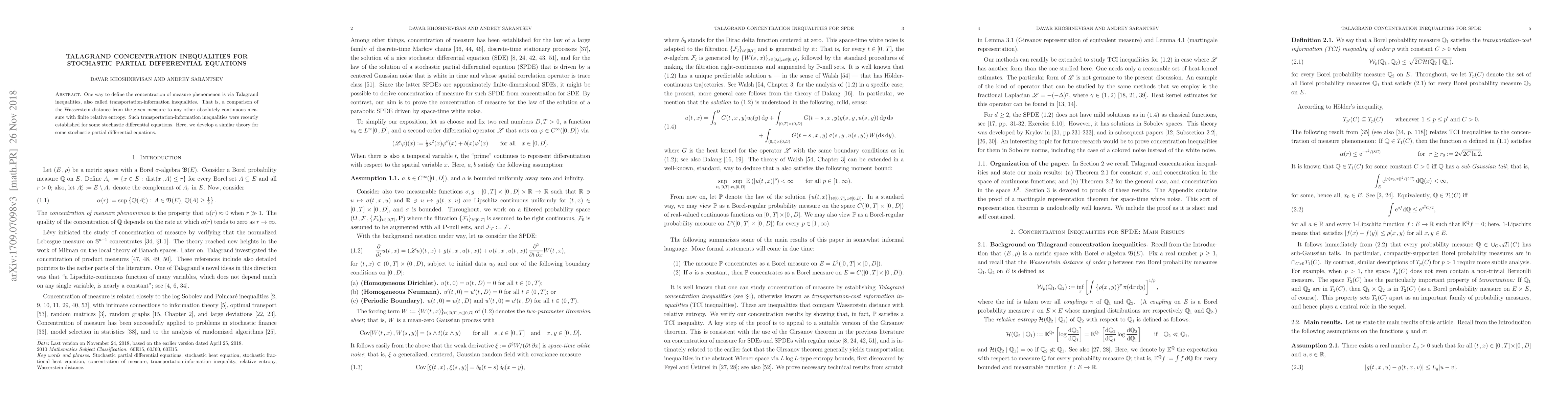 This paper develops Talagrand concentration inequalities for stochastic partial differential equations (SPDEs), extending the transportation-information inequalities previously established for stochastic differential equations to a more complex, spatial setting. The focus is on comparing Wasserstein distances and relative entropy to establish concentration phenomena in SPDEs.