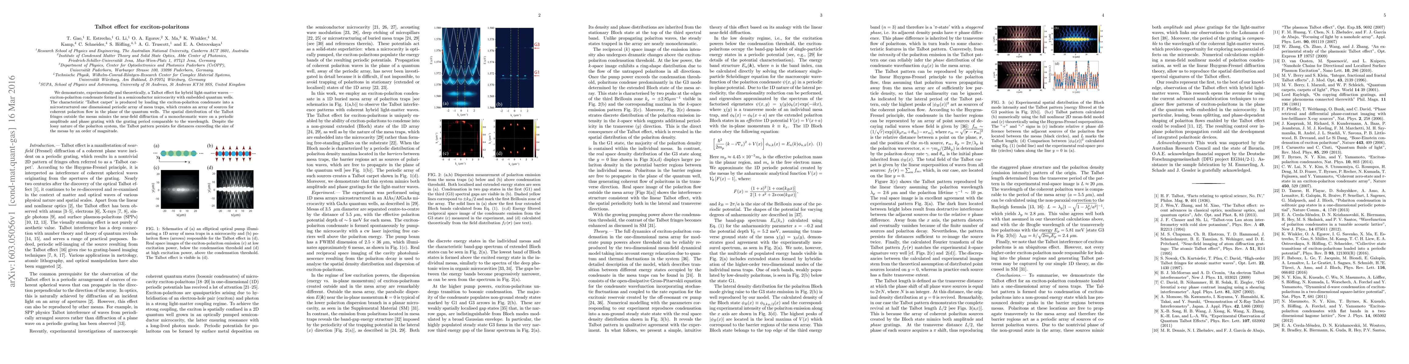 We demonstrate, experimentally and theoretically, a Talbot effect for hybrid light-matter waves -- exciton-polariton condensate formed in a semiconductor microcavity with embedded quantum wells. The characteristic 'Talbot carpet' is produced by loading the exciton-polariton condensate into a microstructured one dimensional periodic array of mesa traps, which creates an array of sources for coherent polariton flow in the plane of the quantum wells. The spatial distribution of the Talbot fringes outside the mesas mimics the near-field diffraction of a monochromatic wave on a periodic amplitude and phase grating with the grating period comparable to the wavelength. Despite the lossy nature of the polariton system, the Talbot pattern persists for distances exceeding the size of the mesas by an order of magnitude.