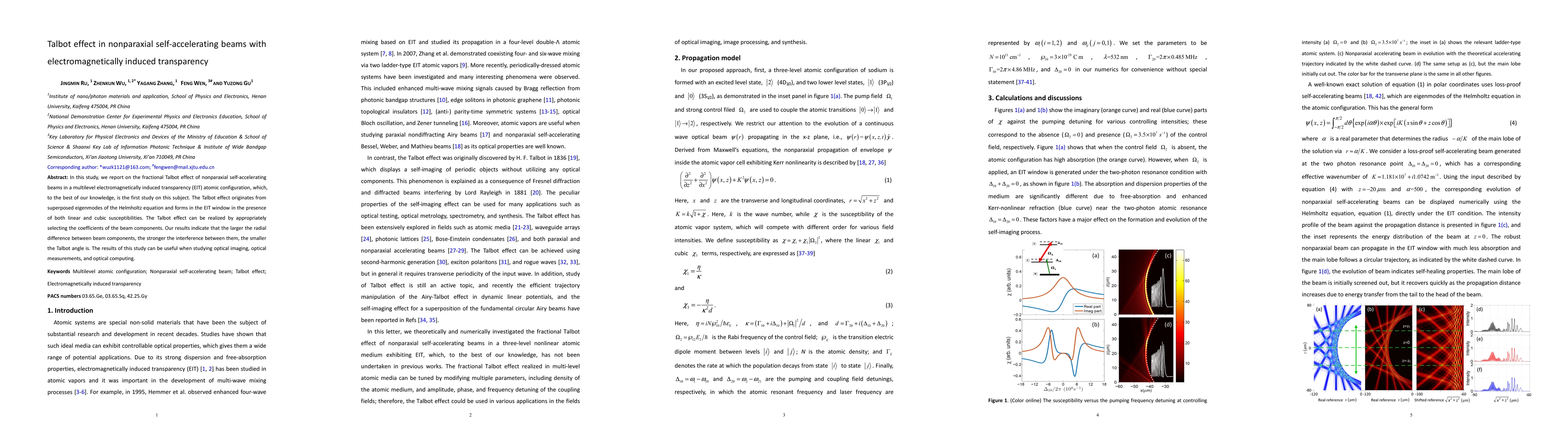 This study investigates the fractional Talbot effect in nonparaxial self-accelerating beams within an electromagnetically induced transparency (EIT) atomic configuration, revealing that the effect depends on the radial difference between beam components. The findings suggest that stronger interference and a smaller Talbot angle occur with larger radial differences, with potential applications in optical imaging, measurements, and computing.