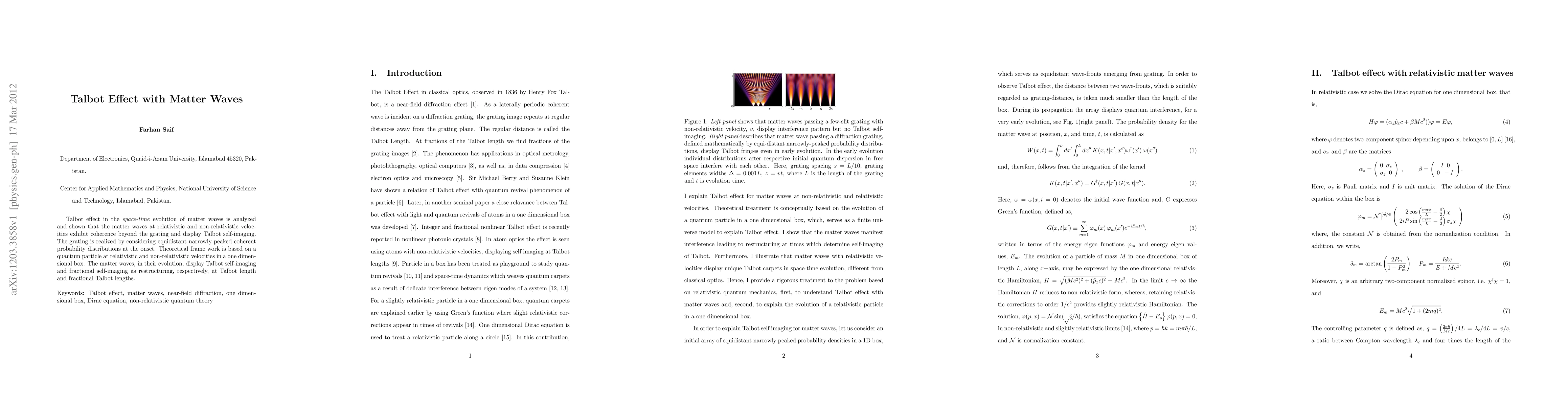 This paper investigates the Talbot effect in matter waves, demonstrating coherence and self-imaging in both relativistic and non-relativistic regimes. Theoretical analysis shows matter waves restructure at Talbot and fractional Talbot lengths within a one-dimensional quantum particle framework.