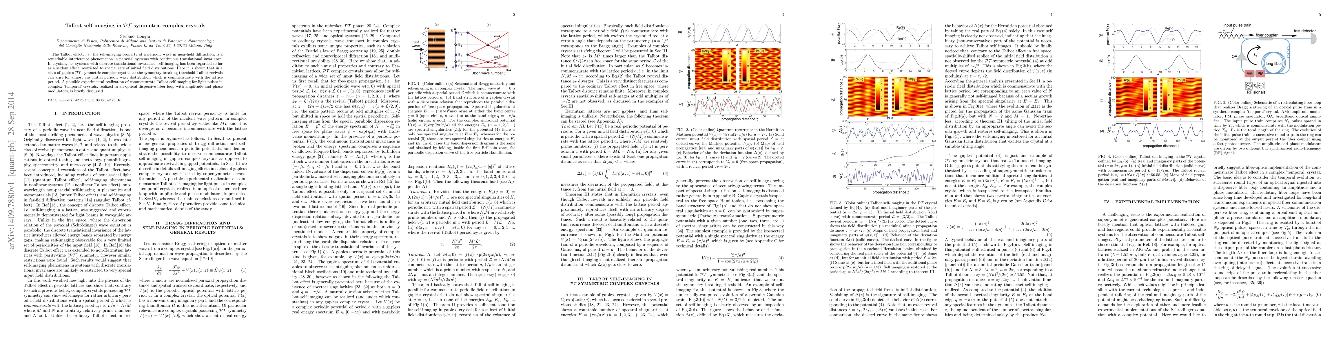 This paper explores Talbot self-imaging in $\mathcal{PT}$-symmetric complex crystals, demonstrating that Talbot revivals can occur for almost any initial periodic wave distribution in these systems at the symmetry breaking threshold. An experimental setup using an optical dispersive fiber loop is proposed for realizing this phenomenon.