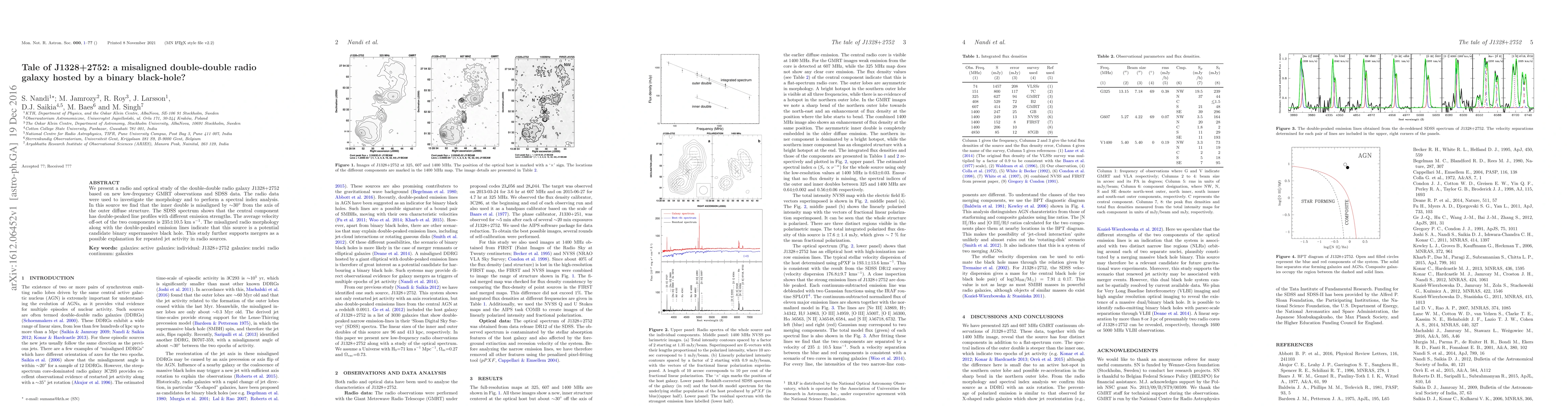 We present a radio and optical study of the double-double radio galaxy J1328+2752 based on new low-frequency GMRT observations and SDSS data. The radio data were used to investigate the morphology and to perform a spectral index analysis. In this source we find that the inner double is misaligned by $\sim$30$^\circ$ from the axis of the outer diffuse structure. The SDSS spectrum shows that the central component has double-peaked line profiles with different emission strengths. The average velocity off-set of the two components is 235$\pm$10.5 km s$^{-1}$. The misaligned radio morphology along with the double-peaked emission lines indicate that this source is a potential candidate binary supermassive black hole. This study further supports mergers as a possible explanation for repeated jet activity in radio sources.
