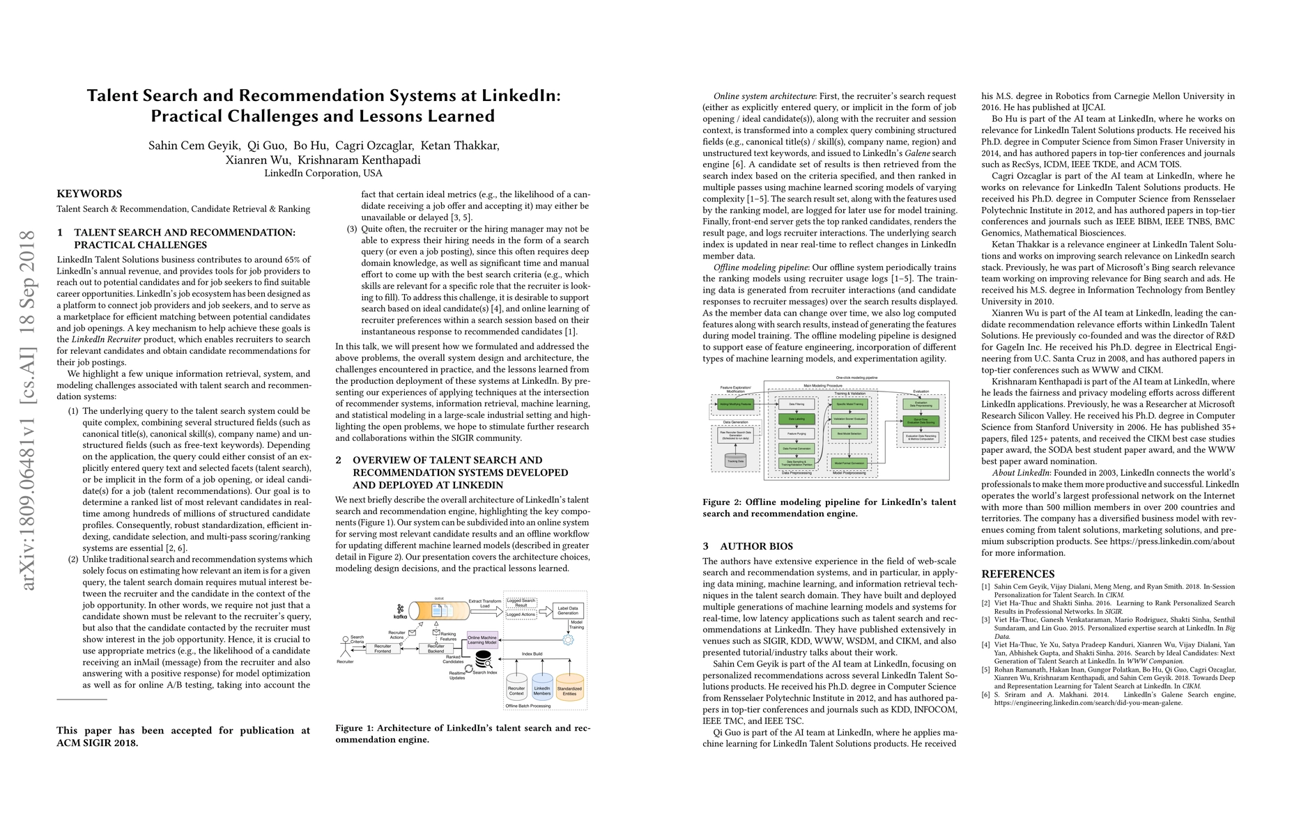 LinkedIn Talent Solutions business contributes to around 65% of LinkedIn's annual revenue, and provides tools for job providers to reach out to potential candidates and for job seekers to find suitable career opportunities. LinkedIn's job ecosystem has been designed as a platform to connect job providers and job seekers, and to serve as a marketplace for efficient matching between potential candidates and job openings. A key mechanism to help achieve these goals is the LinkedIn Recruiter product, which enables recruiters to search for relevant candidates and obtain candidate recommendations for their job postings. In this work, we highlight a set of unique information retrieval, system, and modeling challenges associated with talent search and recommendation systems.