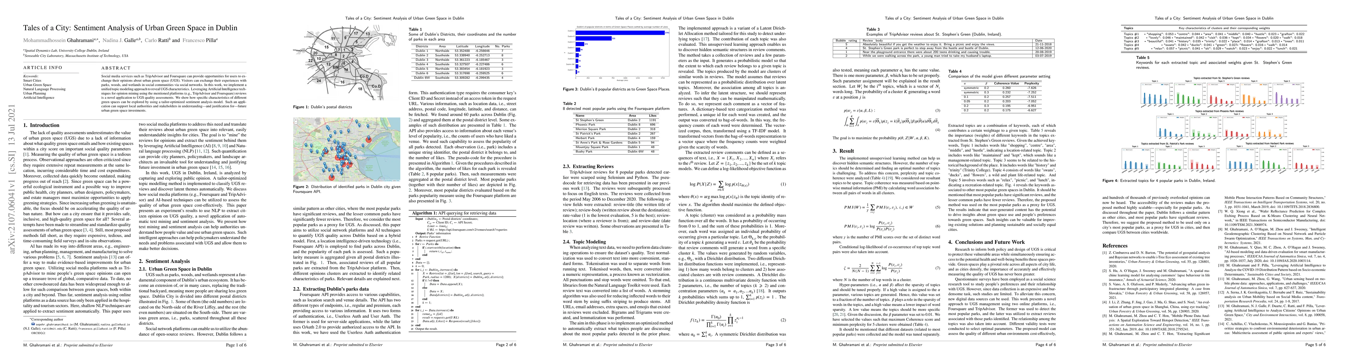 This paper uses topic modeling and sentiment analysis on social media reviews from platforms like TripAdvisor and Foursquare to assess urban green spaces in Dublin. The study reveals specific characteristics of various green spaces, aiding local authorities in justifying future investments in urban green infrastructure.