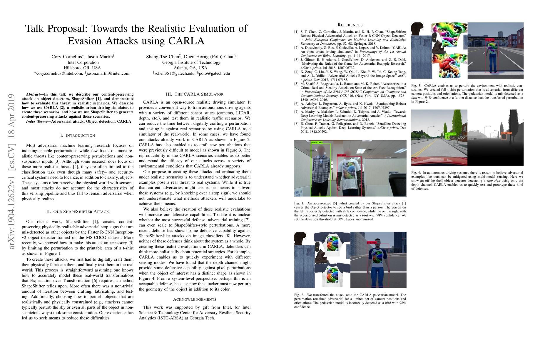 In this talk we describe our content-preserving attack on object detectors, ShapeShifter, and demonstrate how to evaluate this threat in realistic scenarios. We describe how we use CARLA, a realistic urban driving simulator, to create these scenarios, and how we use ShapeShifter to generate content-preserving attacks against those scenarios.