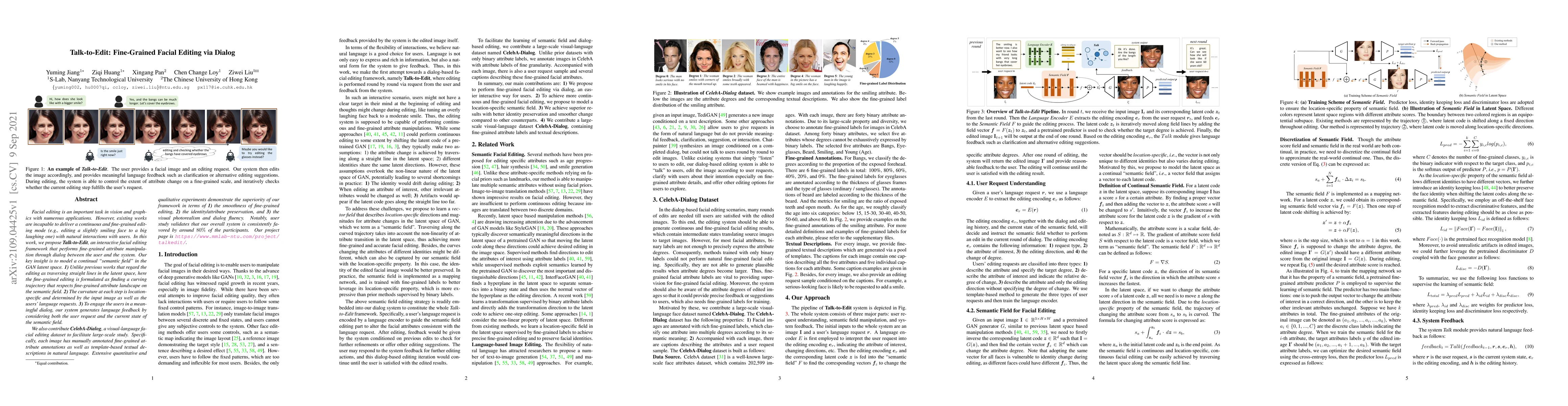 This research introduces Talk-to-Edit, a system that enables fine-grained facial editing through user dialog, achieving smoother and more realistic edits while preserving identity and attribute.